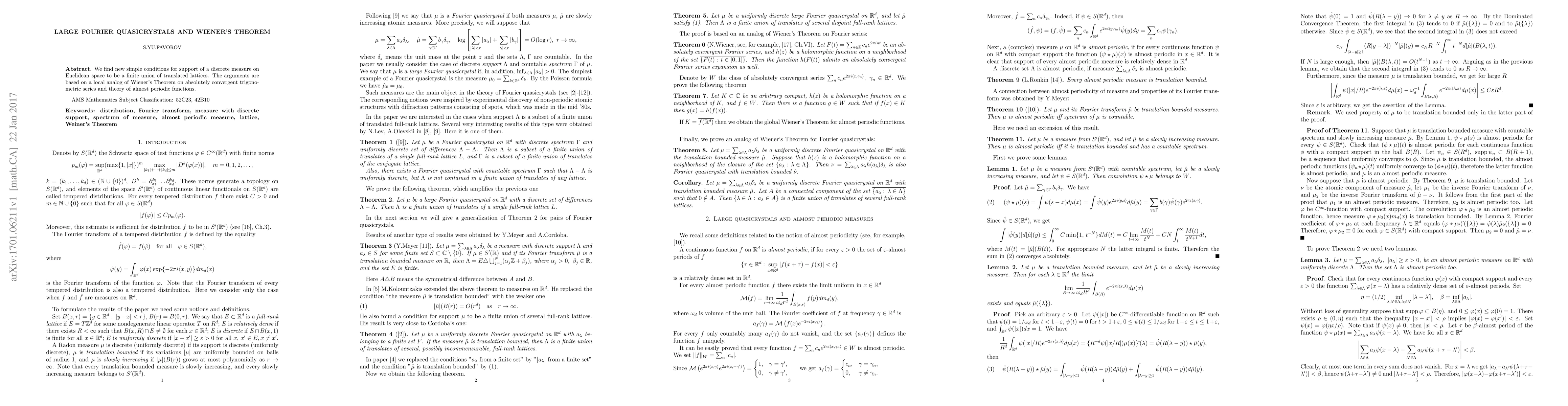 We find new simple conditions for support of a discrete measure on Euclidean space to be a finite union of translated lattices. The arguments are based on a local analog of Wiener's Theorem on absolutely convergent trigonometric series and theory of almost periodic functions.