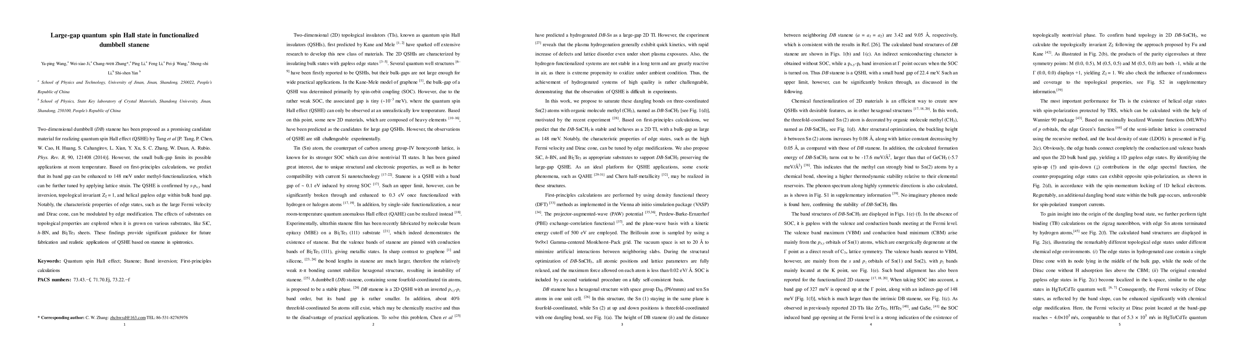 This paper predicts that methyl-functionalization and lattice strain can significantly enhance the band gap of dumbbell stanene to 148 meV, enabling the large-gap quantum spin Hall state. The study confirms the quantum spin Hall effect through band inversion and topological properties, and explores substrate effects on the material's topological characteristics.