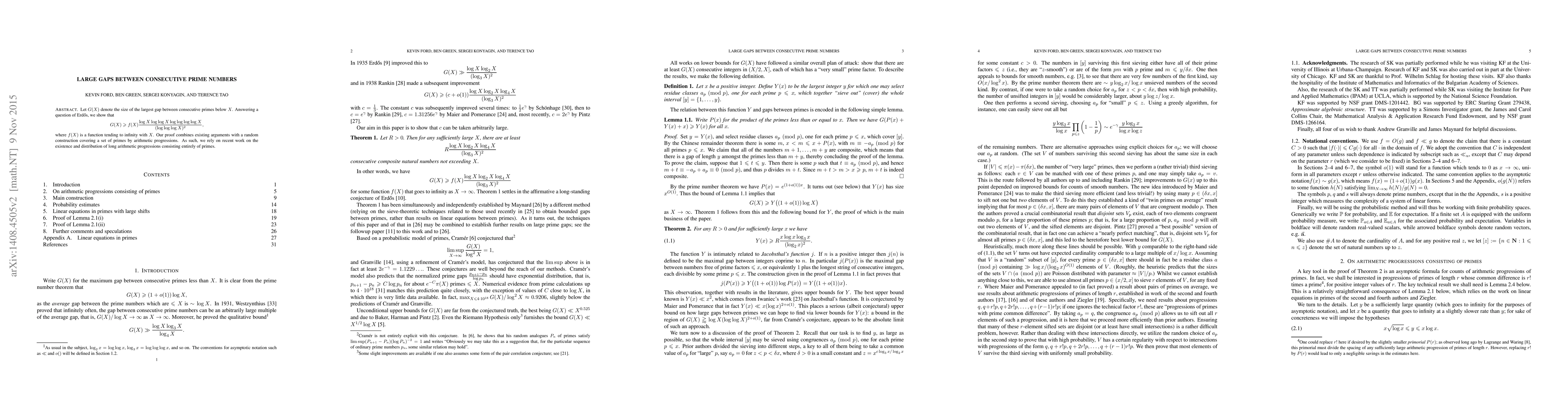 Let $G(X)$ denote the size of the largest gap between consecutive primes below $X$. Answering a question of Erdos, we show that $$G(X) \geq f(X) \frac{\log X \log \log X \log \log \log \log X}{(\log \log \log X)^2},$$ where $f(X)$ is a function tending to infinity with $X$. Our proof combines existing arguments with a random construction covering a set of primes by arithmetic progressions. As such, we rely on recent work on the existence and distribution of long arithmetic progressions consisting entirely of primes.