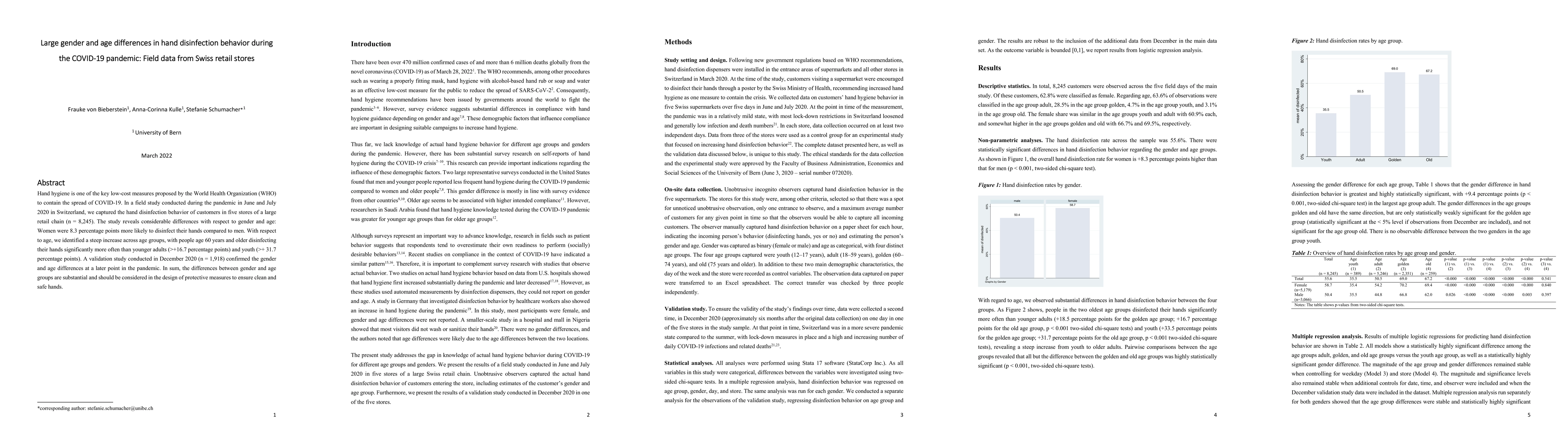 This study found significant gender and age differences in hand disinfection behavior during the COVID-19 pandemic in Swiss retail stores, with women and older adults showing higher compliance rates. These findings underscore the need for targeted public health strategies.