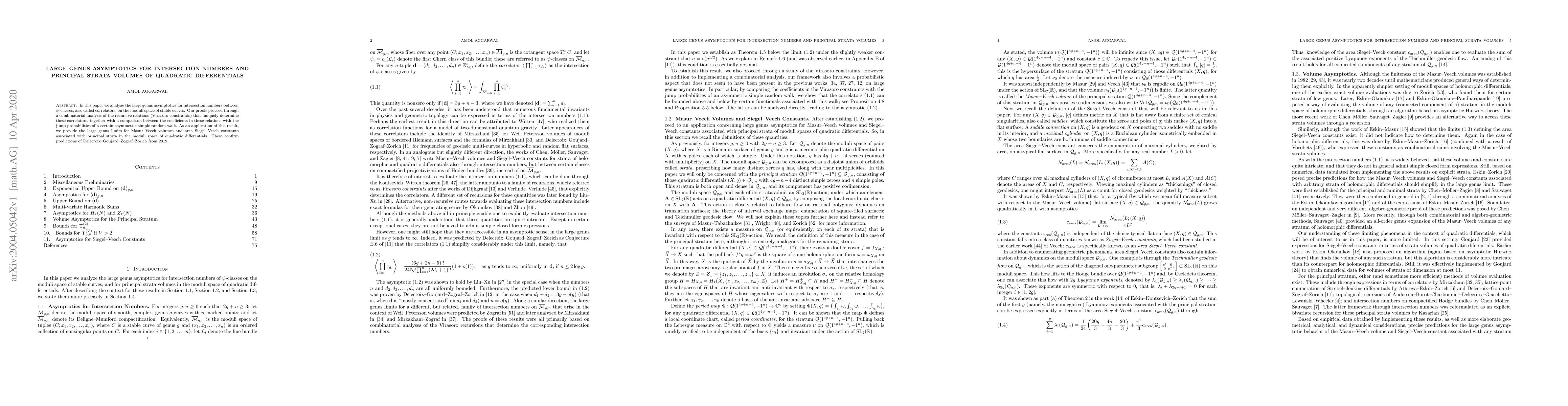 This paper investigates the large genus asymptotics for intersection numbers of $\psi$-classes on the moduli space of stable curves, leveraging combinatorial analysis of Virasoro constraints and comparing these with asymmetric simple random walk probabilities. It also determines the large genus limits for Masur-Veech volumes and area Siegel-Veech constants, confirming 2019 predictions by Delcroix et al.