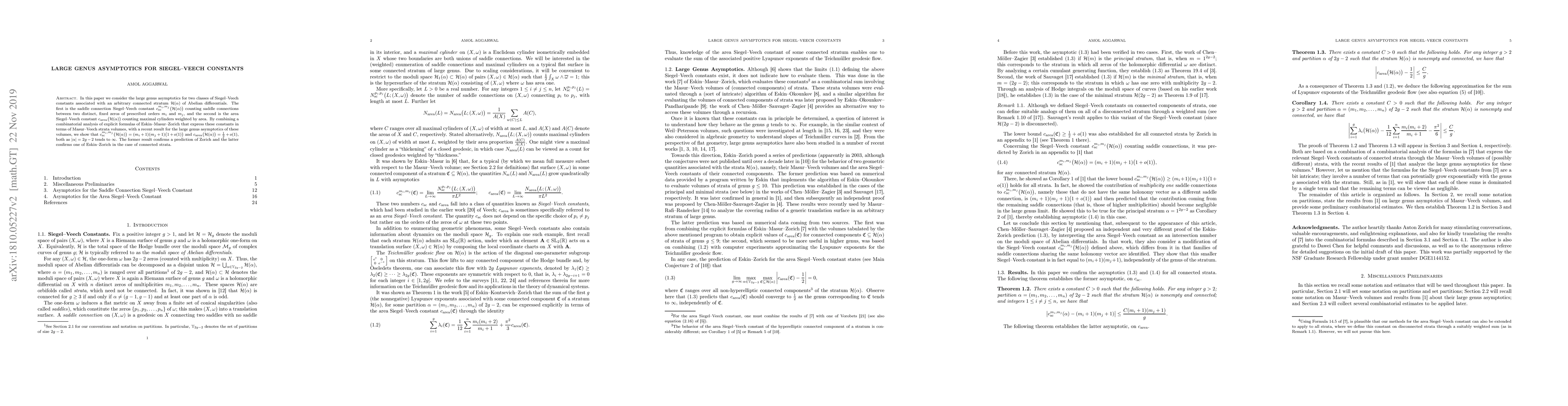 This paper investigates the large genus asymptotics of two Siegel-Veech constants for Abelian differentials, showing that the saddle connection constant scales linearly with the zero orders and the area constant approaches a constant value as genus tends to infinity, confirming predictions by Zorich and Eskin-Zorich.