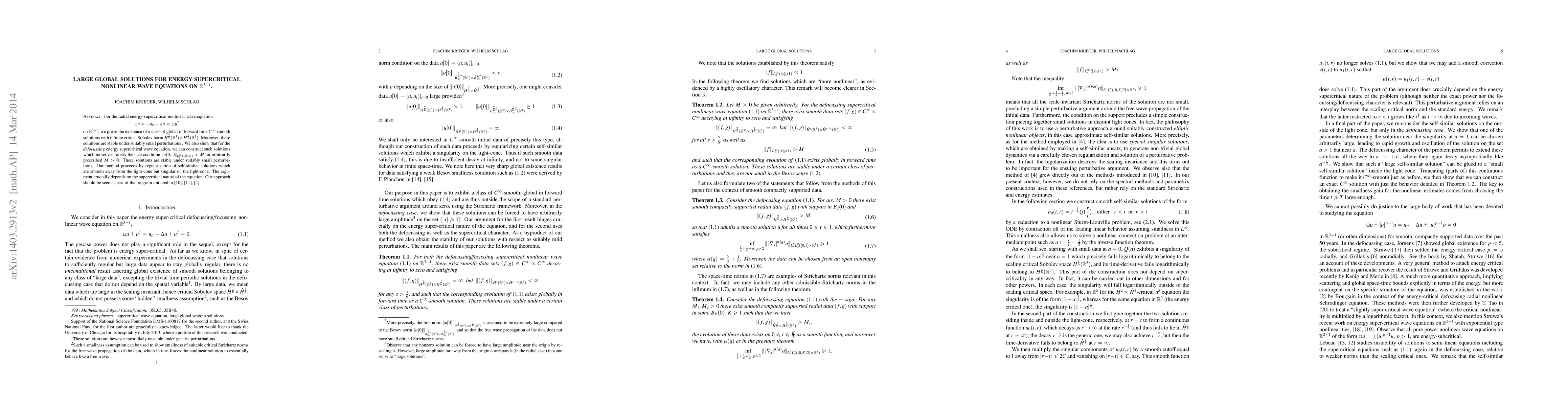 This paper proves the existence of global smooth solutions for radial energy supercritical nonlinear wave equations in 3+1 dimensions, demonstrating stability under small perturbations. The authors construct solutions that satisfy specific size conditions and utilize regularization of self-similar solutions, highlighting the importance of the equation's supercritical nature.