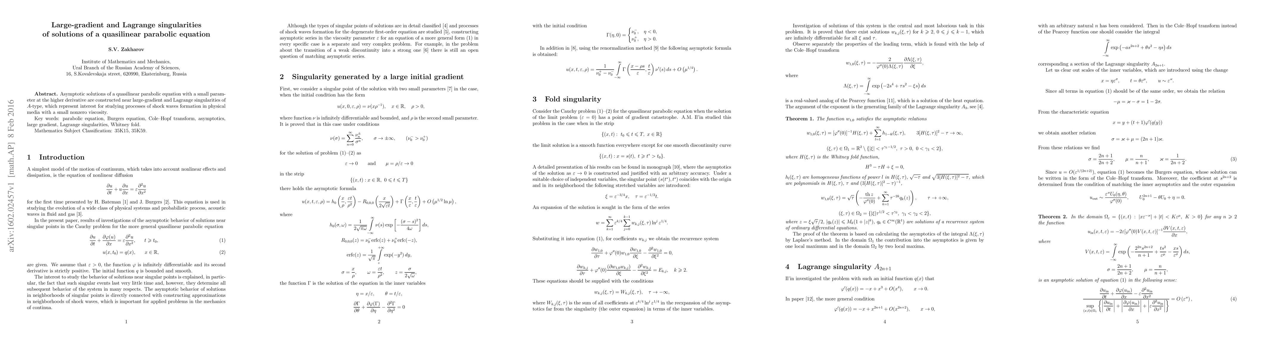 Summary: This paper constructs asymptotic solutions for a quasilinear parabolic equation near large-gradient and Lagrange singularities, focusing on shock wave formation processes in viscous media with a small parameter at the higher derivative. The study aims to understand the dynamics of shock wave development.