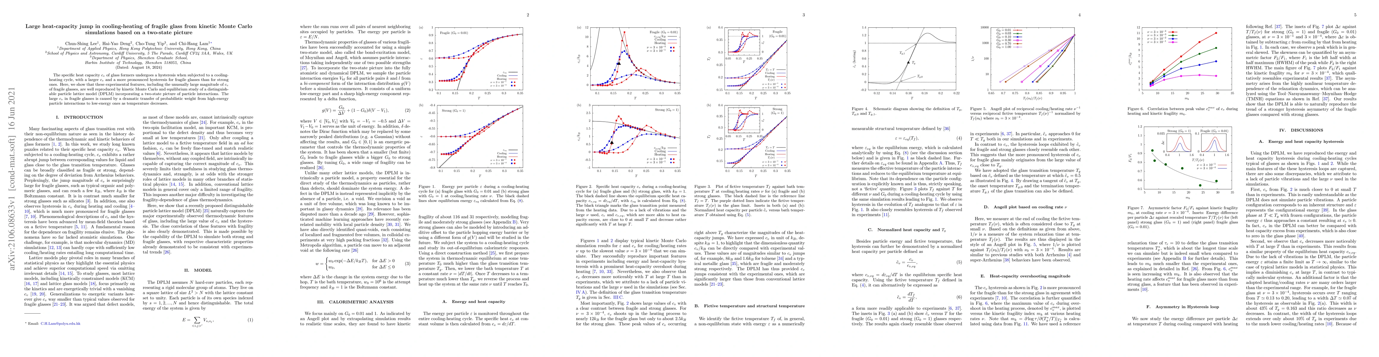 This study uses kinetic Monte Carlo simulations based on a two-state particle interaction model to replicate the large heat-capacity jump observed in fragile glass formers during cooling-heating cycles. The simulations show that the significant specific heat capacity in fragile glasses arises from a shift in probabilistic weight from high-energy to low-energy interactions as temperature decreases.