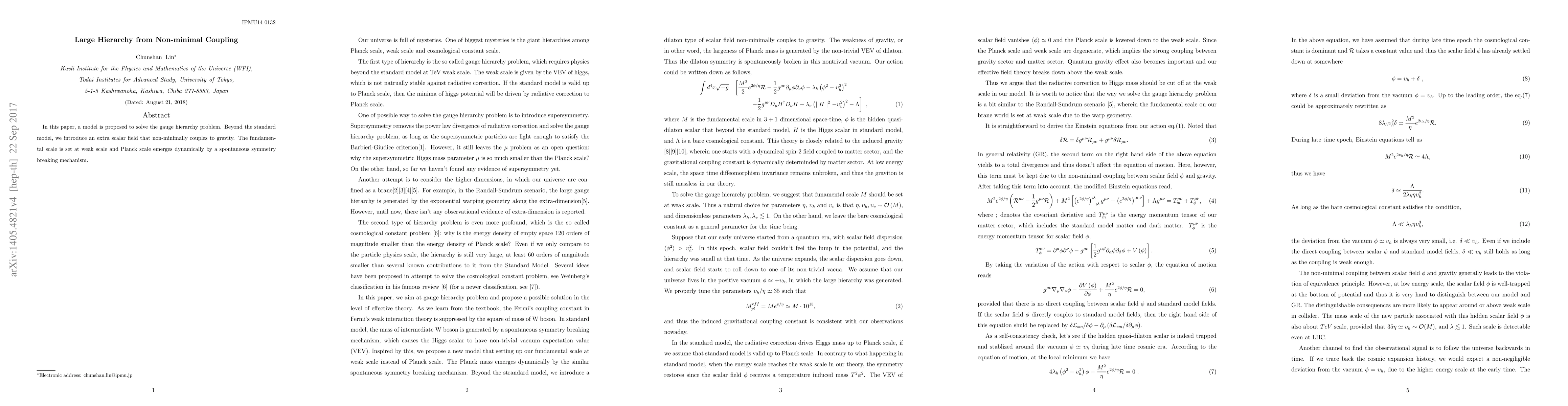 In this paper, a model is proposed to solve the gauge hierarchy problem. Beyond the standard model, we introduce an extra scalar field that non-minimally couples to gravity. The fundamental scale is set at weak scale and Planck scale emerges dynamically by a spontaneous symmetry breaking mechanism.