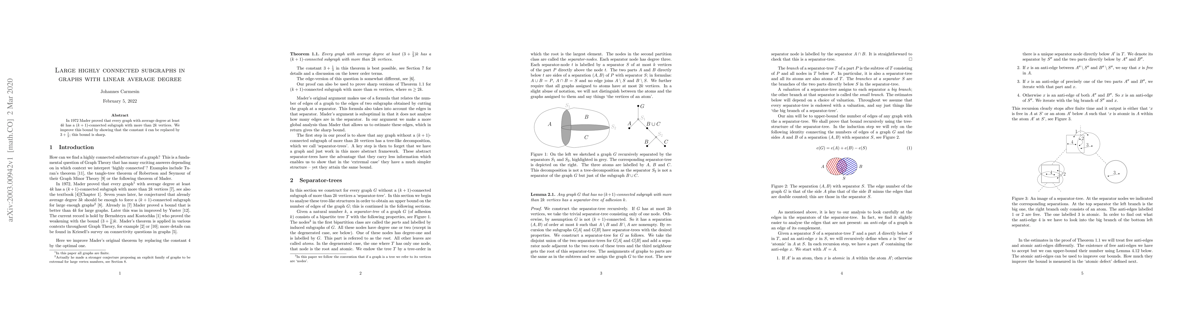 Researchers improved a 1972 bound for finding highly connected subgraphs in graphs with high average degree, showing that the constant $4$ can be replaced by $3+rac{1}{3}$.