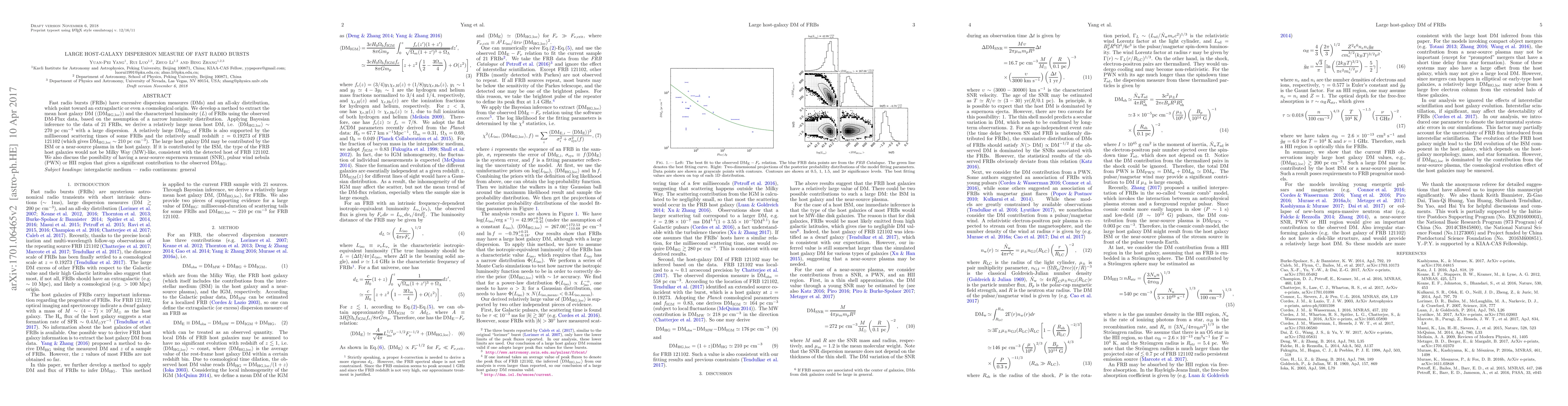 Fast radio bursts (FRBs) have excessive dispersion measures (DMs) and an all-sky distribution, which point toward an extragalactic or even a cosmological origin. We develop a method to extract the mean host galaxy DM ($\left\langle{\rm DM_{HG,loc}}\right\rangle$) and the characterized luminosity ($L$) of FRBs using the observed DM-Flux data, based on the assumption of a narrow luminosity distribution. Applying Bayesian inference to the data of 21 FRBs, we derive a relatively large mean host DM, i.e. $\left\langle{\rm DM_{HG,loc}}\right\rangle \sim 270~\rm{pc~cm^{-3}}$ with a large dispersion. A relatively large ${\rm DM_{HG}}$ of FRBs is also supported by the millisecond scattering times of some FRBs and the relatively small redshift $z=0.19273$ of FRB 121102 (which gives ${\rm DM_{HG,loc}} \sim 210 ~\rm{pc~cm^{-3}}$). The large host galaxy DM may be contributed by the ISM or a near-source plasma in the host galaxy. If it is contributed by the ISM, the type of the FRB host galaxies would not be Milky Way (MW)-like, consistent with the detected host of FRB 121102. We also discuss the possibility of having a near-source supernova remnant (SNR), pulsar wind nebula (PWN) or HII region that gives a significant contribution to the observed ${\rm DM_{HG}}$.