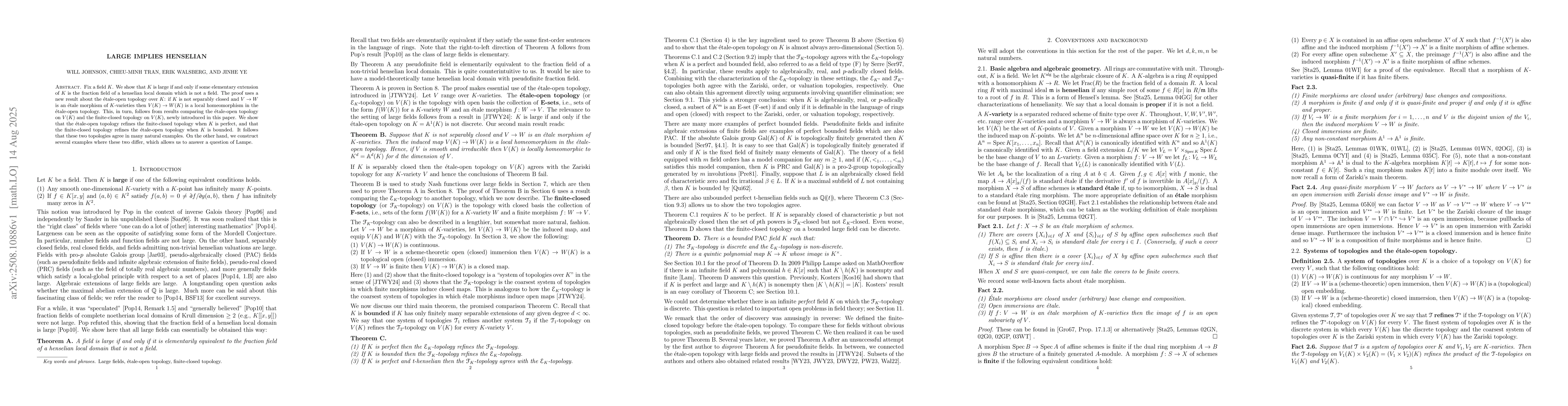Fix a field $K$. We show that $K$ is large if and only if some elementary extension of $K$ is the fraction field of a henselian local domain which is not a field. The proof uses a new result about the \'etale-open topology over $K$: if $K$ is not separably closed and $V \to W$ is an \'etale morphism of $K$-varieties then $V(K) \to W(K)$ is a local homeomorphism in the \'etale-open topology. This, in turn, follows from results comparing the \'etale-open topology on $V(K)$ and the finite-closed topology on $V(K)$, newly introduced in this paper. We show that the \'etale-open topology refines the finite-closed topology when $K$ is perfect, and that the finite-closed topology refines the \'etale-open topology when $K$ is bounded. It follows that these two topologies agree in many natural examples. On the other hand, we construct several examples where these two differ, which allows us to answer a question of Lampe.