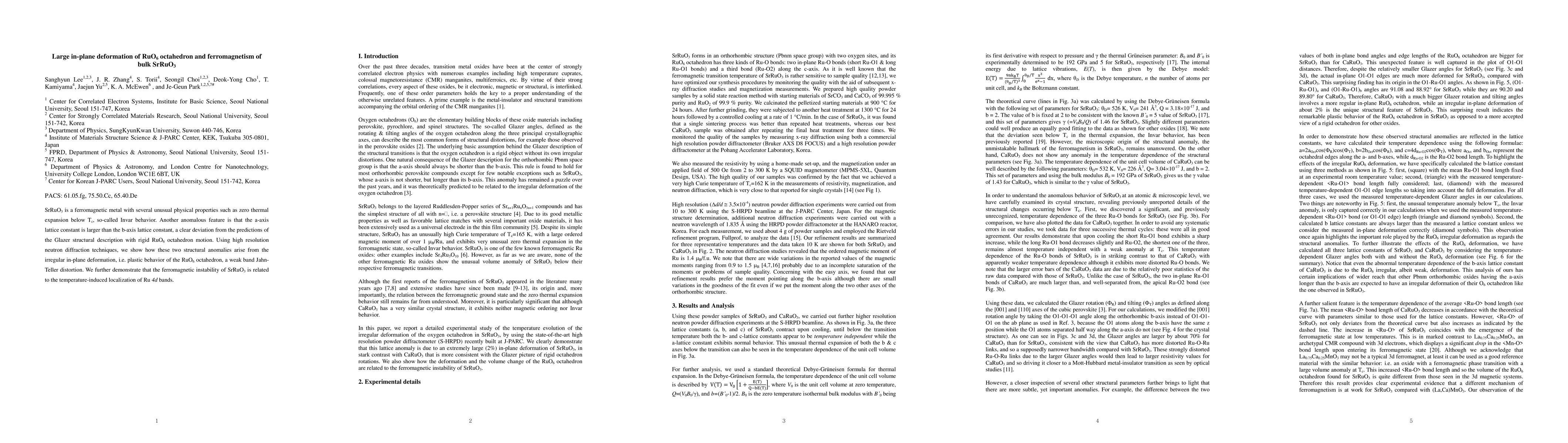 Researchers used neutron diffraction to study SrRuO3, a ferromagnetic metal with unusual properties like zero thermal expansion and an irregularly deformed RuO6 octahedron. They found that the octahedron's deformation leads to localization of Ru 4d bands and explains the material's ferromagnetic instability.