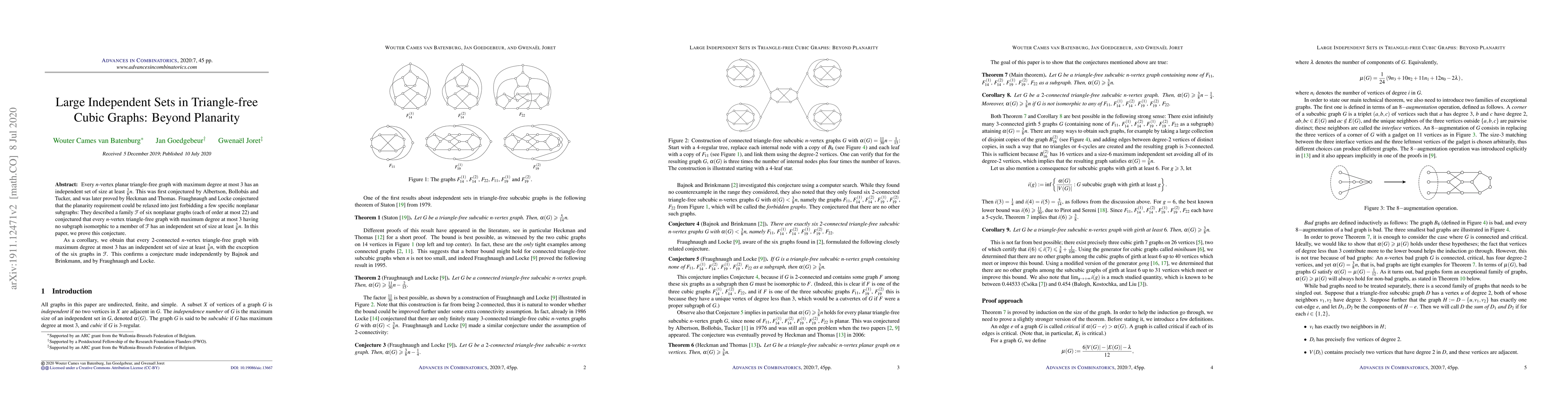 This paper proves the conjecture that every $n$-vertex triangle-free cubic graph, excluding those containing specific nonplanar subgraphs, has an independent set of size at least $\frac{3}{8}n$. This extends the result beyond planar graphs, confirming earlier conjectures by Fraughnaugh, Locke, and others.