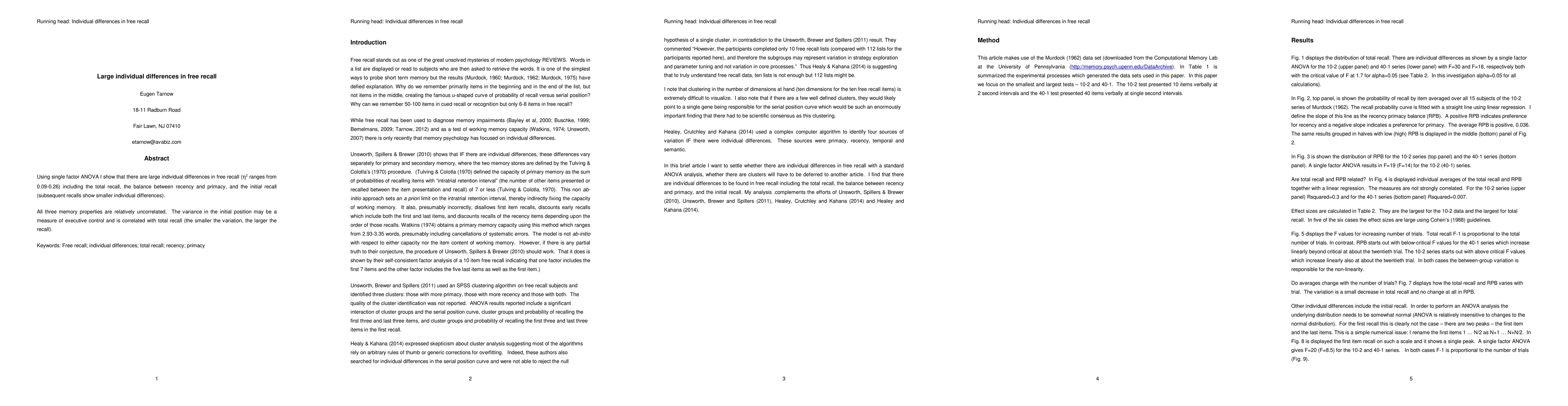 Using single factor ANOVA I show that there are large individual differences in free recall ({\eta} ranges from 0.09-0.26) including the total recall, the balance between recency and primacy, and the initial recall (subsequent recalls show smaller individual differences). All three memory properties are relatively uncorrelated. The variance in the initial position may be a measure of executive control and is correlated with total recall (the smaller the variation, the larger the recall).