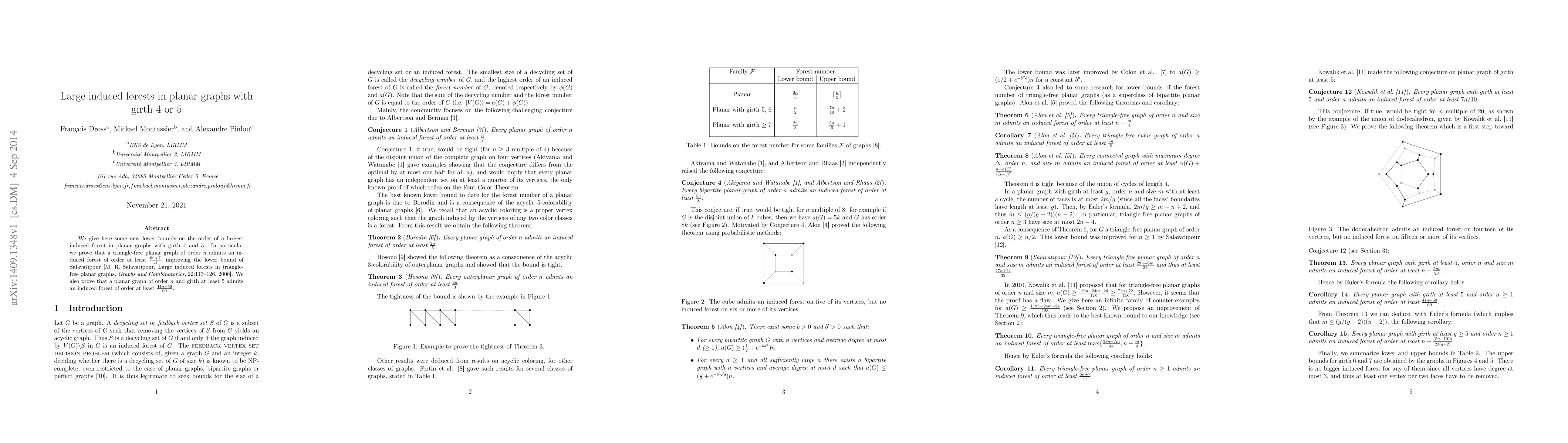This paper establishes new lower bounds for the size of the largest induced forest in planar graphs with girth 4 or 5. Specifically, it improves the lower bound for triangle-free planar graphs to $\frac{6n+7}{11}$ and provides a new lower bound for planar graphs with girth at least 5 as $\frac{44n+50}{69}$.