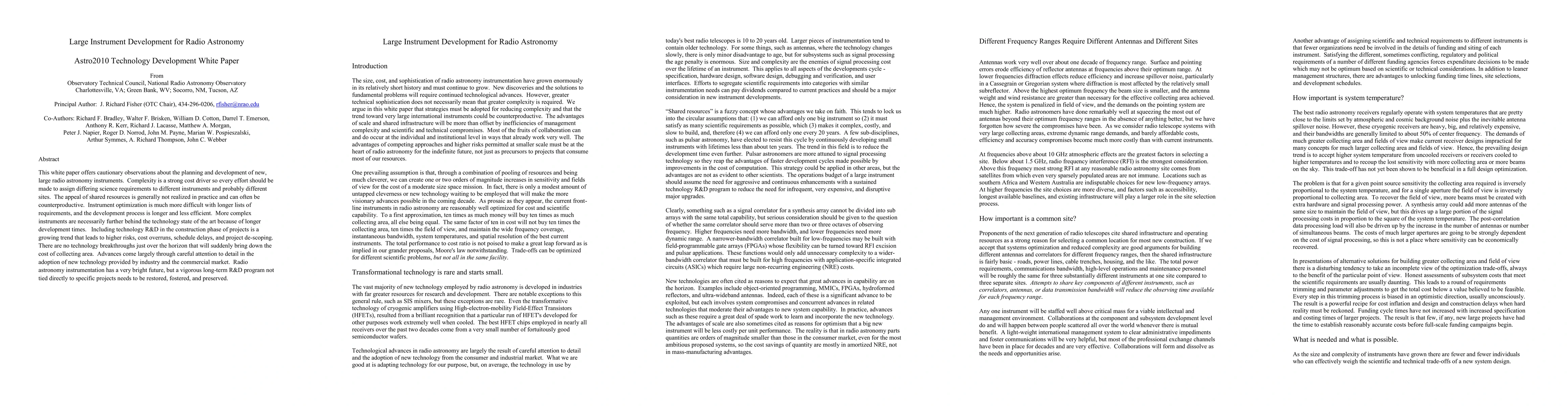 This white paper offers cautionary observations about the planning and development of new, large radio astronomy instruments. Complexity is a strong cost driver so every effort should be made to assign differing science requirements to different instruments and probably different sites. The appeal of shared resources is generally not realized in practice and can often be counterproductive. Instrument optimization is much more difficult with longer lists of requirements, and the development process is longer and less efficient. More complex instruments are necessarily further behind the technology state of the art because of longer development times. Including technology R&D in the construction phase of projects is a growing trend that leads to higher risks, cost overruns, schedule delays, and project de-scoping. There are no technology breakthroughs just over the horizon that will suddenly bring down the cost of collecting area. Advances come largely through careful attention to detail in the adoption of new technology provided by industry and the commercial market. Radio astronomy instrumentation has a very bright future, but a vigorous long-term R&D program not tied directly to specific projects needs to be restored, fostered, and preserved.