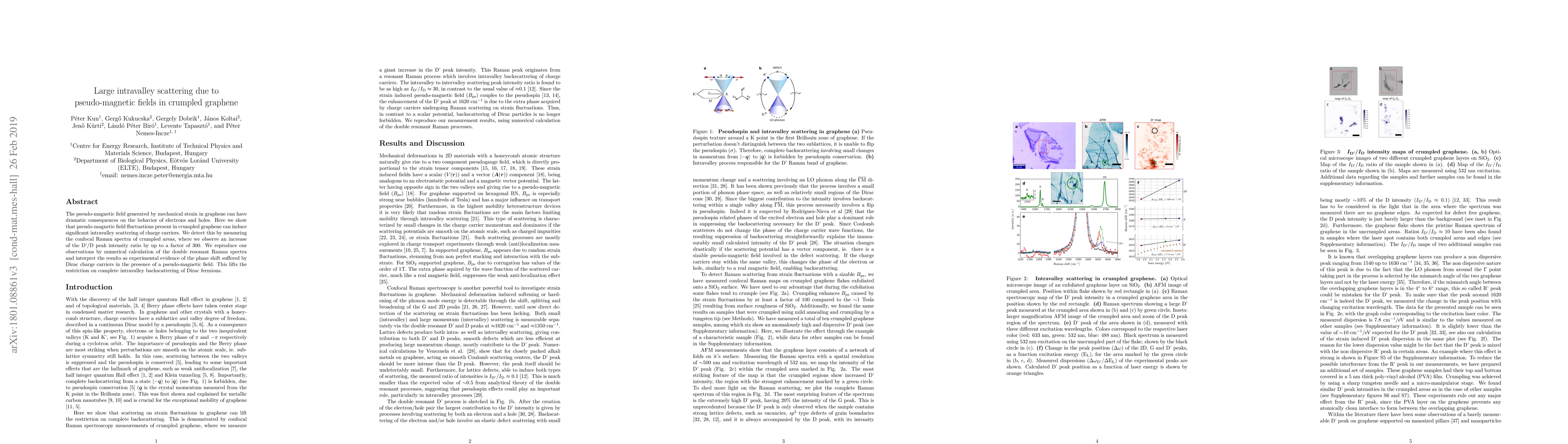 The pseudo-magnetic field generated by mechanical strain in graphene can have dramatic consequences on the behavior of electrons and holes. Here we show that pseudo-magnetic field fluctuations present in crumpled graphene can induce significant intravalley scattering of charge carriers. We detect this by measuring the confocal Raman spectra of crumpled areas, where we observe an increase of the D'/D peak intensity ratio by up to a factor of 300. We reproduce our observations by numerical calculation of the double resonant Raman spectra and interpret the results as experimental evidence of the phase shift suffered by Dirac charge carriers in the presence of a pseudo-magnetic field. This lifts the restriction on complete intravalley backscattering of Dirac fermions.