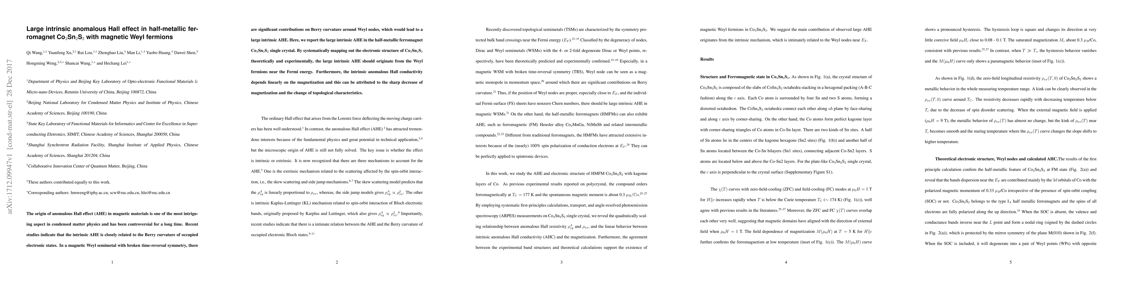This paper reports a large intrinsic anomalous Hall effect in the half-metallic ferromagnet Co3Sn2S2, attributed to magnetic Weyl fermions. The intrinsic AHE originates from the significant Berry curvature contributions around Weyl nodes, with the effect depending linearly on magnetization.