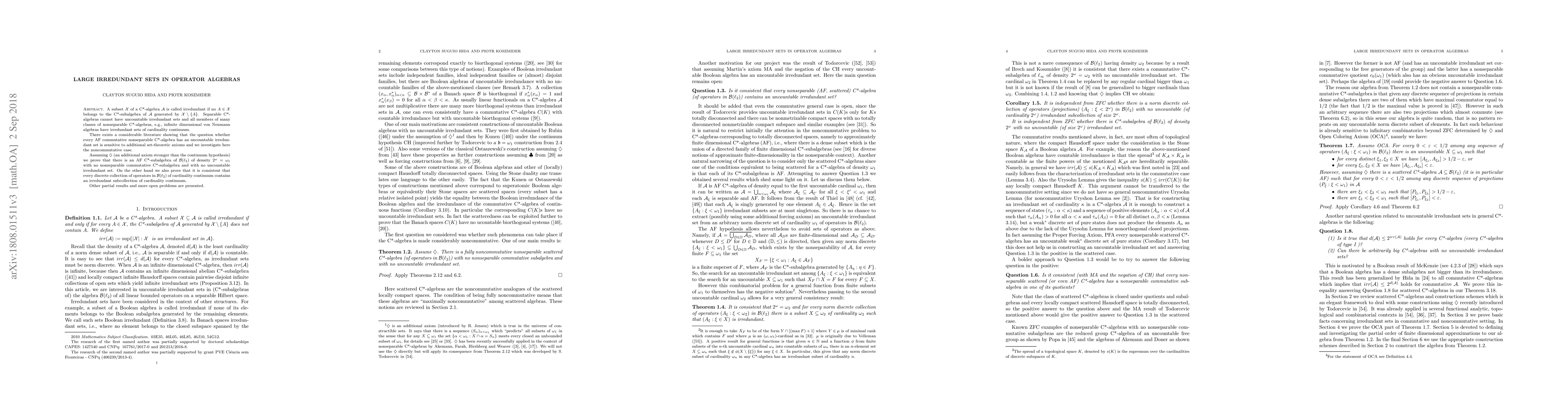 Researchers investigate irredundant sets in operator algebras, finding that certain non-separable C*-algebras have no uncountable irredundant sets when assuming a specific set-theoretic axiom, and showing that other discrete collections of operators may contain such sets.