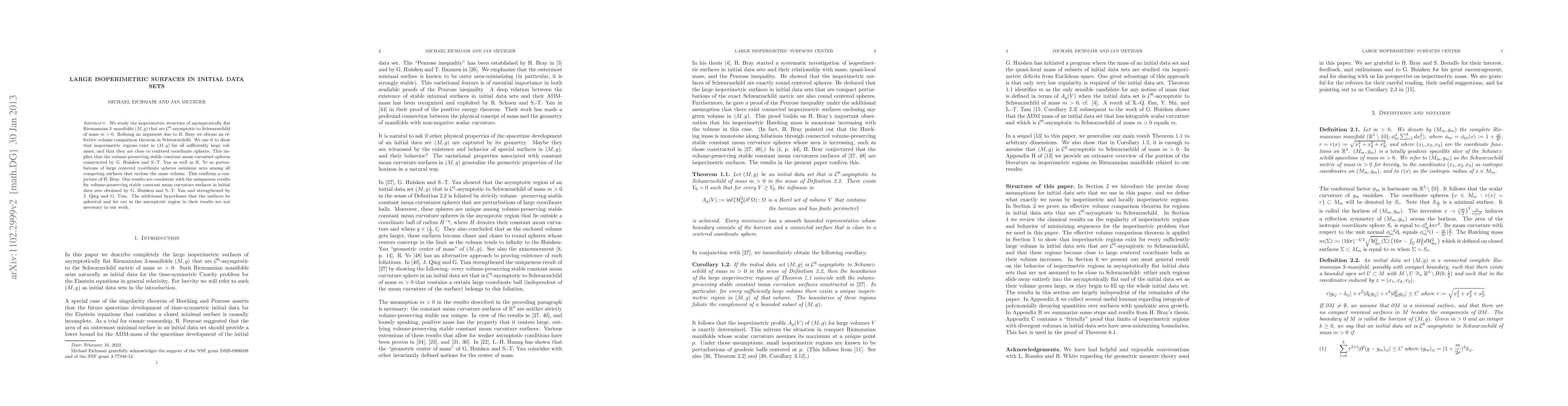 This paper proves the existence of large isoperimetric surfaces in asymptotically flat Riemannian 3-manifolds resembling Schwarzschild spacetime, showing they closely resemble centered coordinate spheres. It confirms a conjecture by H. Bray and aligns with previous uniqueness results for volume-preserving stable constant mean curvature surfaces.