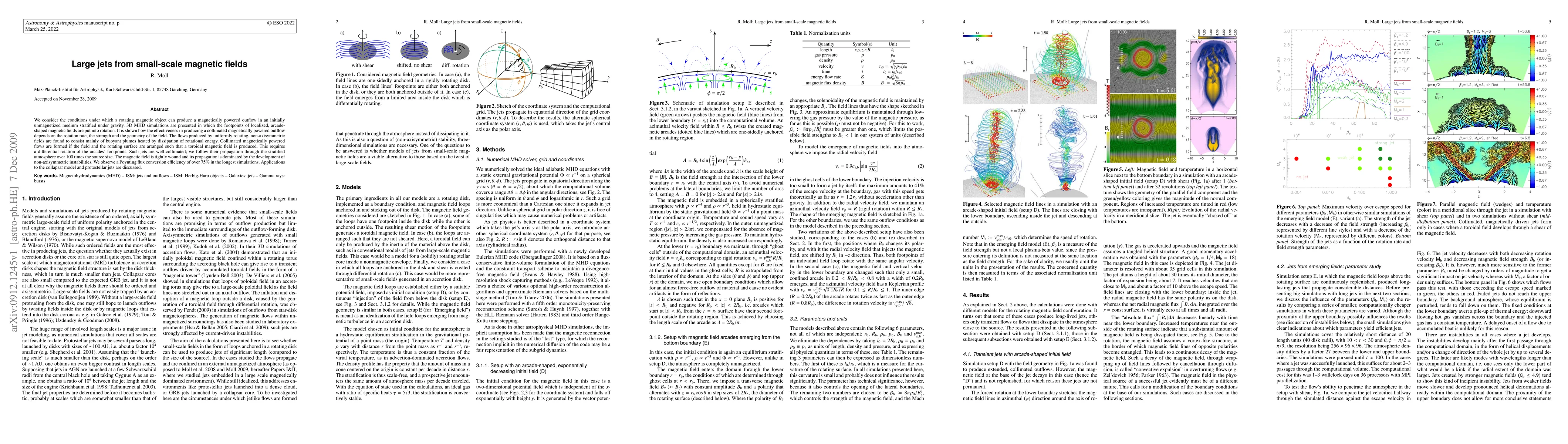 This paper explores how small-scale rotating magnetic fields can generate large, collimated jets in an initially unmagnetized, gravity-stratified medium. Through 3D MHD simulations, it demonstrates that differential rotation of magnetic field footpoints is crucial for producing well-collimated jets with high Poynting flux conversion efficiency, relevant for astrophysical phenomena like collapsars and protostellar jets.