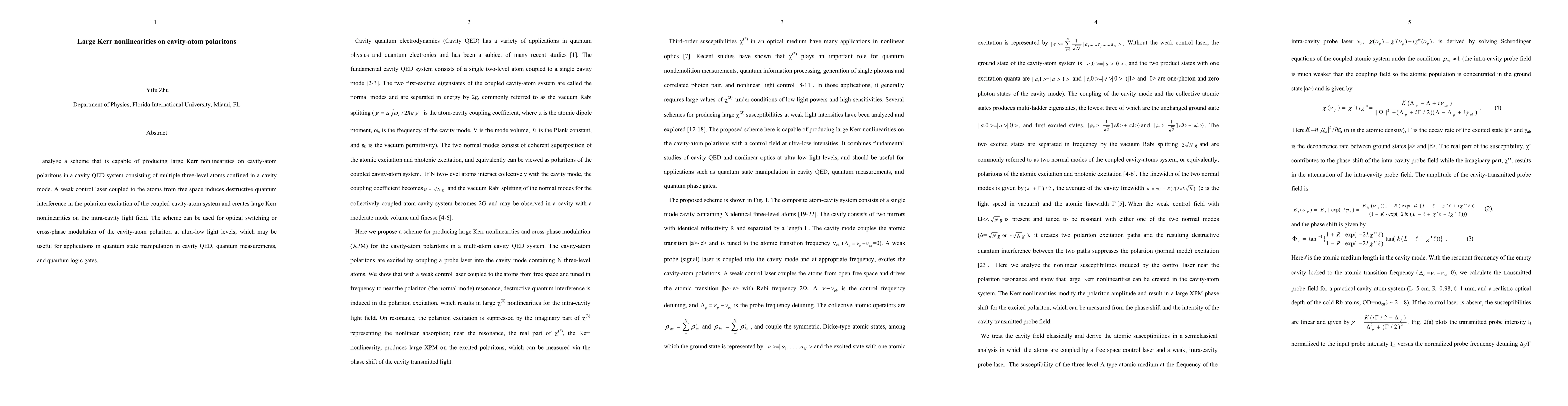 This research investigates a method to achieve significant Kerr nonlinearities in cavity-atom polaritons through destructive quantum interference induced by a weak control laser, enabling potential applications in quantum state manipulation, measurements, and logic gates. The scheme shows promise for optical switching and cross-phase modulation at ultra-low light levels.