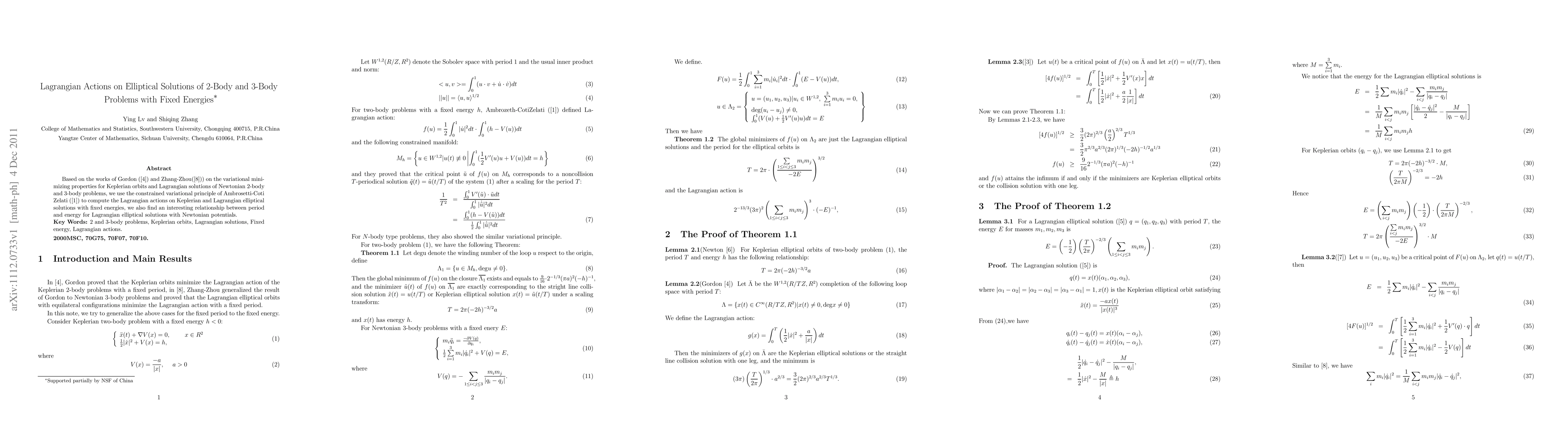 This paper computes Lagrangian actions on elliptical solutions for 2-body and 3-body problems using constrained variational principles, revealing a relationship between period and energy for Lagrangian elliptical solutions with fixed energies. It builds on the works of Gordon and Zhang-Zhou, extending their variational methods.