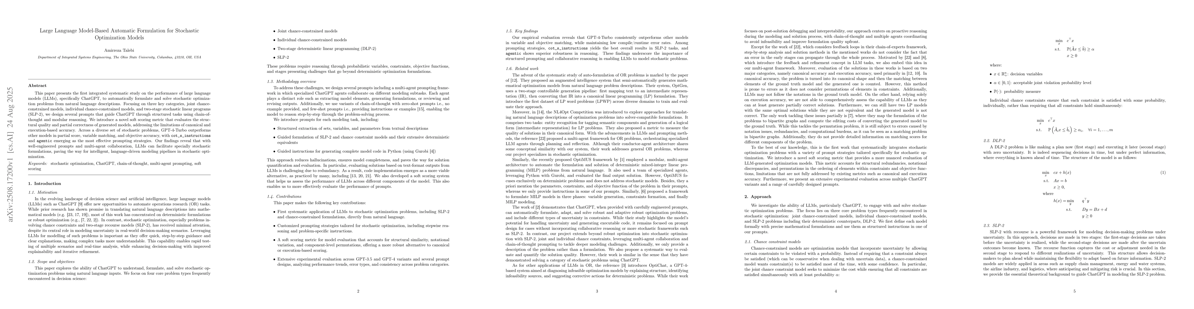 This paper presents the first integrated systematic study on the performance of large language models (LLMs), specifically ChatGPT, to automatically formulate and solve stochastic optimiza- tion problems from natural language descriptions. Focusing on three key categories, joint chance- constrained models, individual chance-constrained models, and two-stage stochastic linear programs (SLP-2), we design several prompts that guide ChatGPT through structured tasks using chain-of- thought and modular reasoning. We introduce a novel soft scoring metric that evaluates the struc- tural quality and partial correctness of generated models, addressing the limitations of canonical and execution-based accuracy. Across a diverse set of stochastic problems, GPT-4-Turbo outperforms other models in partial score, variable matching, and objective accuracy, with cot_s_instructions and agentic emerging as the most effective prompting strategies. Our findings reveal that with well-engineered prompts and multi-agent collaboration, LLMs can facilitate specially stochastic formulations, paving the way for intelligent, language-driven modeling pipelines in stochastic opti- mization.