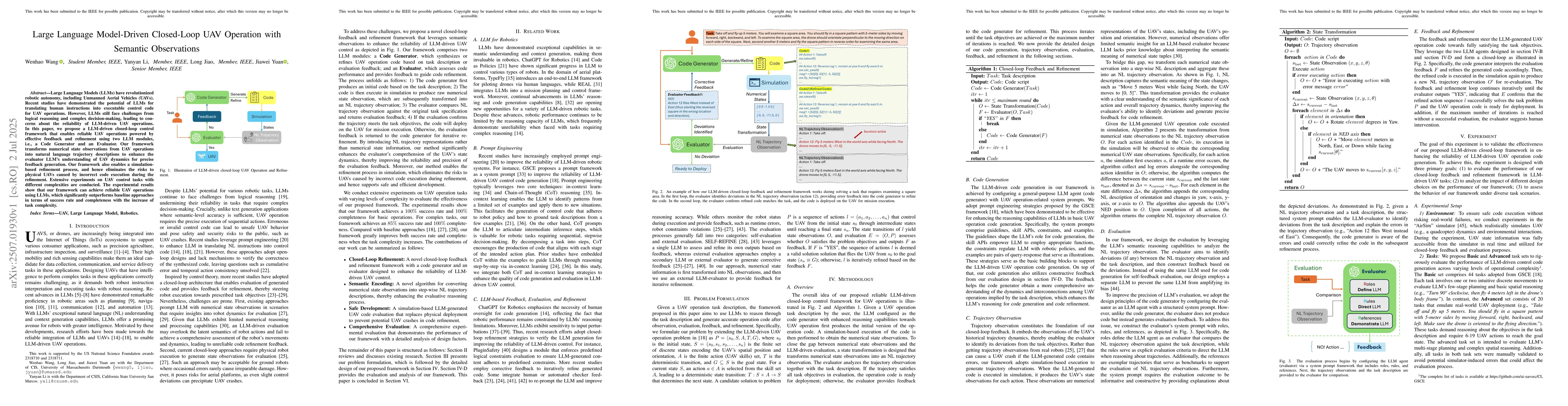 Recent advances in large Language Models (LLMs) have revolutionized mobile robots, including unmanned aerial vehicles (UAVs), enabling their intelligent operation within Internet of Things (IoT) ecosystems. However, LLMs still face challenges from logical reasoning and complex decision-making, leading to concerns about the reliability of LLM-driven UAV operations in IoT applications. In this paper, we propose a LLM-driven closed-loop control framework that enables reliable UAV operations powered by effective feedback and refinement using two LLM modules, i.e., a Code Generator and an Evaluator. Our framework transforms numerical state observations from UAV operations into natural language trajectory descriptions to enhance the evaluator LLM's understanding of UAV dynamics for precise feedback generation. Our framework also enables a simulation-based refinement process, and hence eliminates the risks to physical UAVs caused by incorrect code execution during the refinement. Extensive experiments on UAV control tasks with different complexities are conducted. The experimental results show that our framework can achieve reliable UAV operations using LLMs, which significantly outperforms baseline approaches in terms of success rate and completeness with the increase of task complexity.