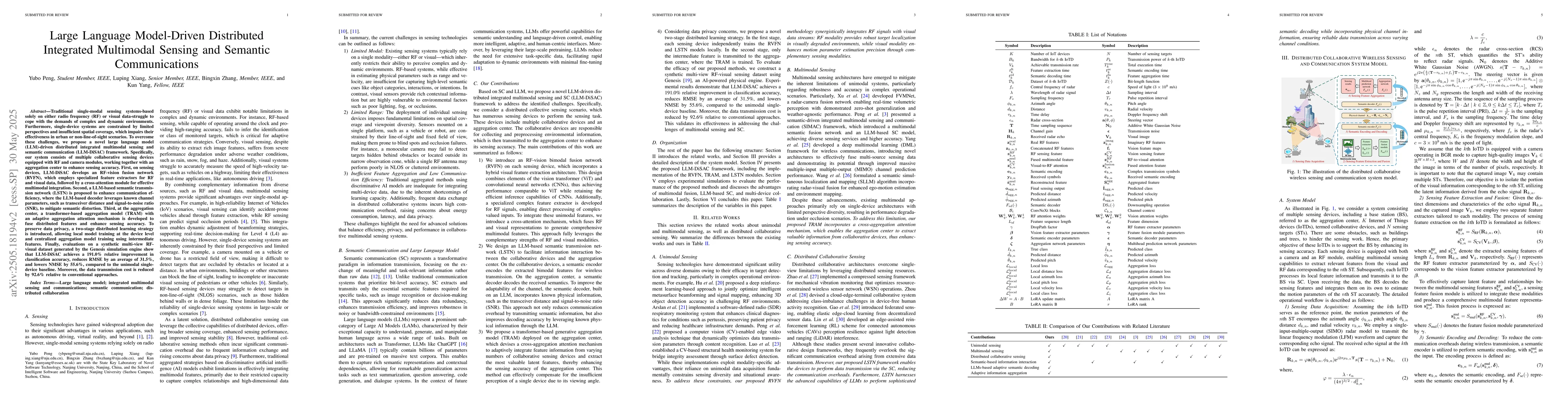 This work stands out by integrating large language models into a distributed multimodal sensing system, proposing novel RF-vision fusion and LLM-based semantic transmission networks, and employing a transformer-based aggregation model for feature fusion, all while ensuring data privacy through a two-stage distributed learning strategy.