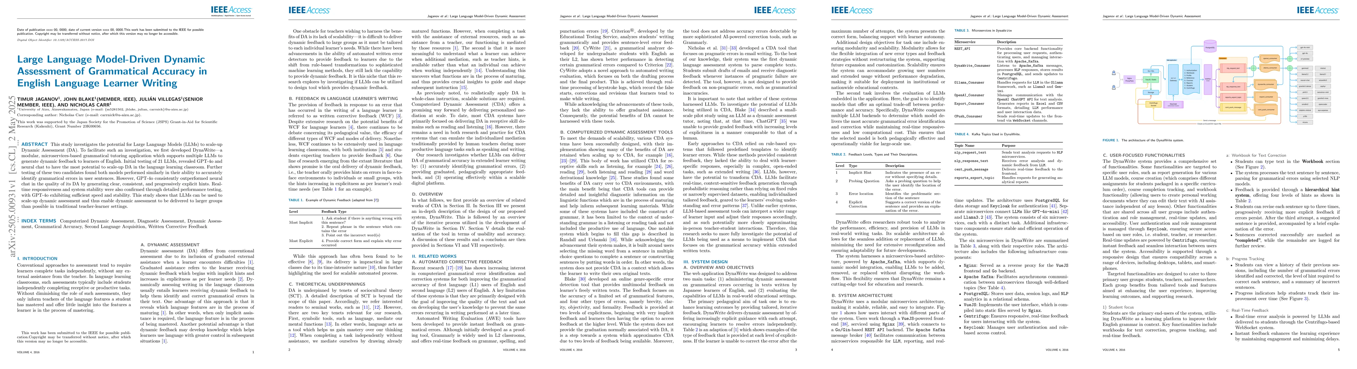 This study investigates the potential for Large Language Models (LLMs) to scale-up Dynamic Assessment (DA). To facilitate such an investigation, we first developed DynaWrite-a modular, microservices-based grammatical tutoring application which supports multiple LLMs to generate dynamic feedback to learners of English. Initial testing of 21 LLMs, revealed GPT-4o and neural chat to have the most potential to scale-up DA in the language learning classroom. Further testing of these two candidates found both models performed similarly in their ability to accurately identify grammatical errors in user sentences. However, GPT-4o consistently outperformed neural chat in the quality of its DA by generating clear, consistent, and progressively explicit hints. Real-time responsiveness and system stability were also confirmed through detailed performance testing, with GPT-4o exhibiting sufficient speed and stability. This study shows that LLMs can be used to scale-up dynamic assessment and thus enable dynamic assessment to be delivered to larger groups than possible in traditional teacher-learner settings.