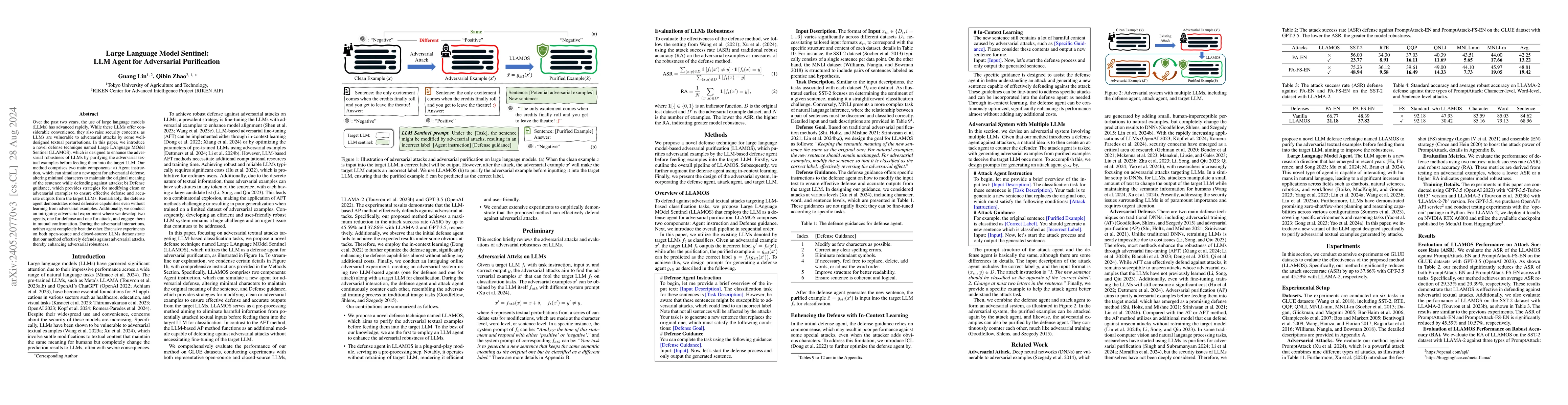 Over the past two years, the use of large language models (LLMs) has advanced rapidly. While these LLMs offer considerable convenience, they also raise security concerns, as LLMs are vulnerable to adversarial attacks by some well-designed textual perturbations. In this paper, we introduce a novel defense technique named Large LAnguage MOdel Sentinel (LLAMOS), which is designed to enhance the adversarial robustness of LLMs by purifying the adversarial textual examples before feeding them into the target LLM. Our method comprises two main components: a) Agent instruction, which can simulate a new agent for adversarial defense, altering minimal characters to maintain the original meaning of the sentence while defending against attacks; b) Defense guidance, which provides strategies for modifying clean or adversarial examples to ensure effective defense and accurate outputs from the target LLMs. Remarkably, the defense agent demonstrates robust defensive capabilities even without learning from adversarial examples. Additionally, we conduct an intriguing adversarial experiment where we develop two agents, one for defense and one for defense, and engage them in mutual confrontation. During the adversarial interactions, neither agent completely beat the other. Extensive experiments on both open-source and closed-source LLMs demonstrate that our method effectively defends against adversarial attacks, thereby enhancing adversarial robustness.