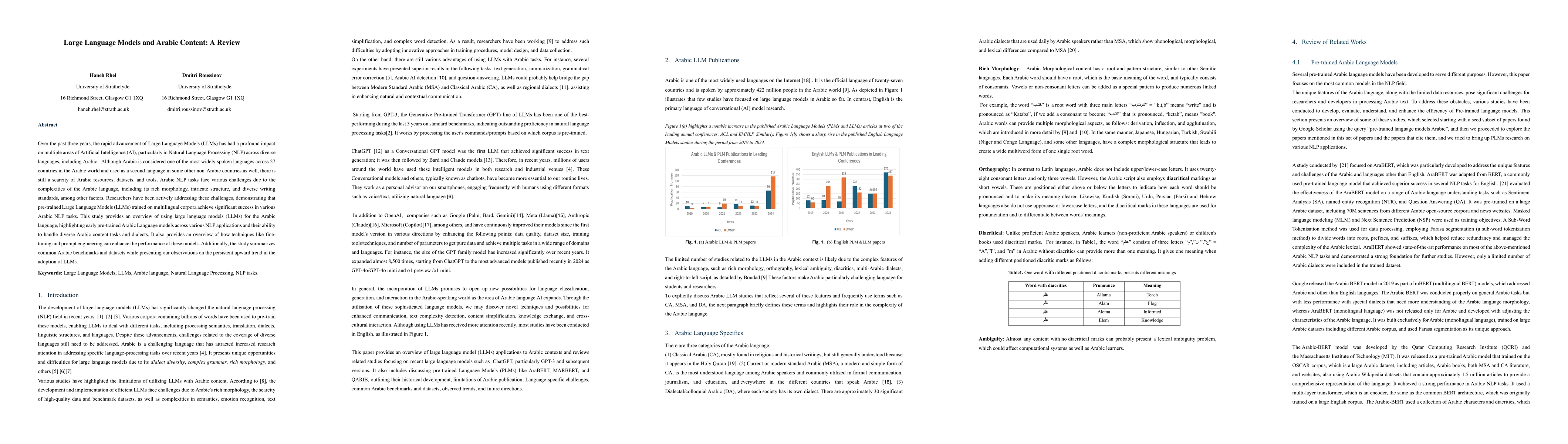 This work differentiates itself by focusing on the application of LLMs to Arabic content, addressing its unique challenges, and summarizing recent advancements in this area.