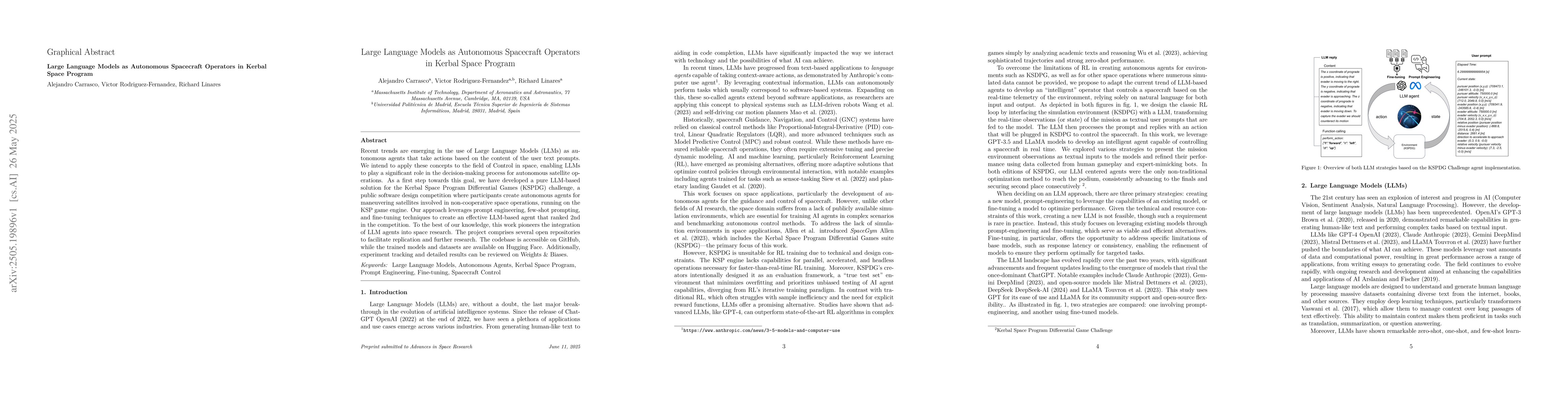 Researchers developed an LLM-based autonomous spacecraft operator for the Kerbal Space Program, ranking 2nd in a competition and pioneering integration of LLMs into space research.