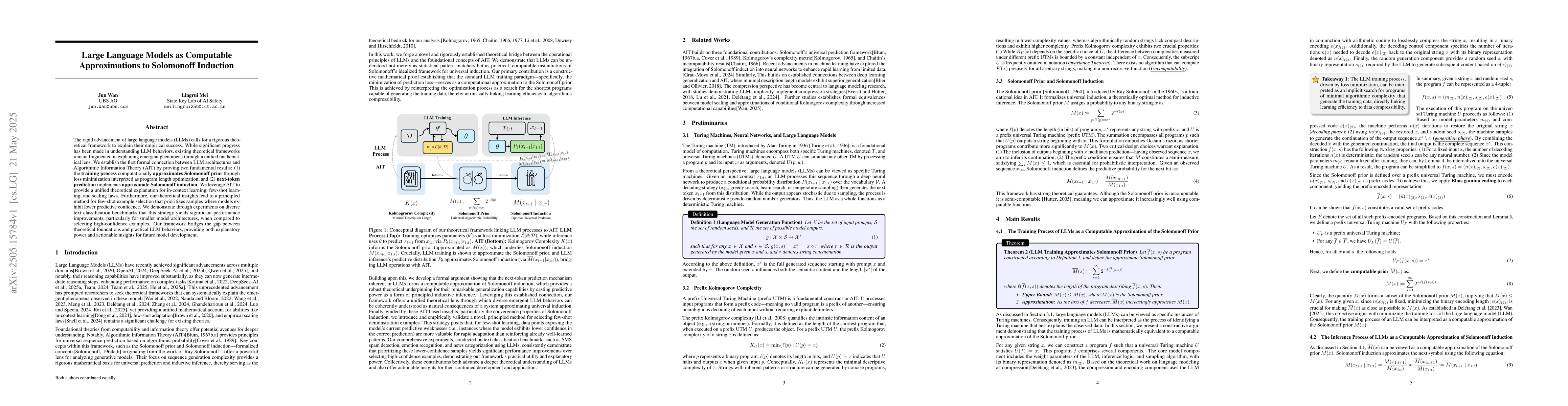 The rapid advancement of large language models (LLMs) calls for a rigorous theoretical framework to explain their empirical success. While significant progress has been made in understanding LLM behaviors, existing theoretical frameworks remain fragmented in explaining emergent phenomena through a unified mathematical lens. We establish the first formal connection between LLM architectures and Algorithmic Information Theory (AIT) by proving two fundamental results: (1) the training process computationally approximates Solomonoff prior through loss minimization interpreted as program length optimization, and (2) next-token prediction implements approximate Solomonoff induction. We leverage AIT to provide a unified theoretical explanation for in-context learning, few-shot learning, and scaling laws. Furthermore, our theoretical insights lead to a principled method for few-shot example selection that prioritizes samples where models exhibit lower predictive confidence. We demonstrate through experiments on diverse text classification benchmarks that this strategy yields significant performance improvements, particularly for smaller model architectures, when compared to selecting high-confidence examples. Our framework bridges the gap between theoretical foundations and practical LLM behaviors, providing both explanatory power and actionable insights for future model development.