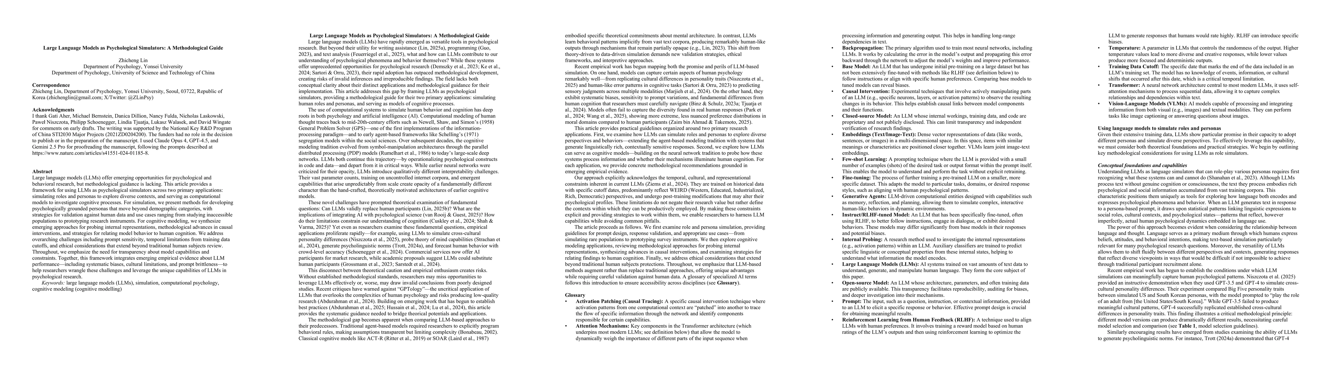 Large language models (LLMs) offer emerging opportunities for psychological and behavioral research, but methodological guidance is lacking. This article provides a framework for using LLMs as psychological simulators across two primary applications: simulating roles and personas to explore diverse contexts, and serving as computational models to investigate cognitive processes. For simulation, we present methods for developing psychologically grounded personas that move beyond demographic categories, with strategies for validation against human data and use cases ranging from studying inaccessible populations to prototyping research instruments. For cognitive modeling, we synthesize emerging approaches for probing internal representations, methodological advances in causal interventions, and strategies for relating model behavior to human cognition. We address overarching challenges including prompt sensitivity, temporal limitations from training data cutoffs, and ethical considerations that extend beyond traditional human subjects review. Throughout, we emphasize the need for transparency about model capabilities and constraints. Together, this framework integrates emerging empirical evidence about LLM performance--including systematic biases, cultural limitations, and prompt brittleness--to help researchers wrangle these challenges and leverage the unique capabilities of LLMs in psychological research.