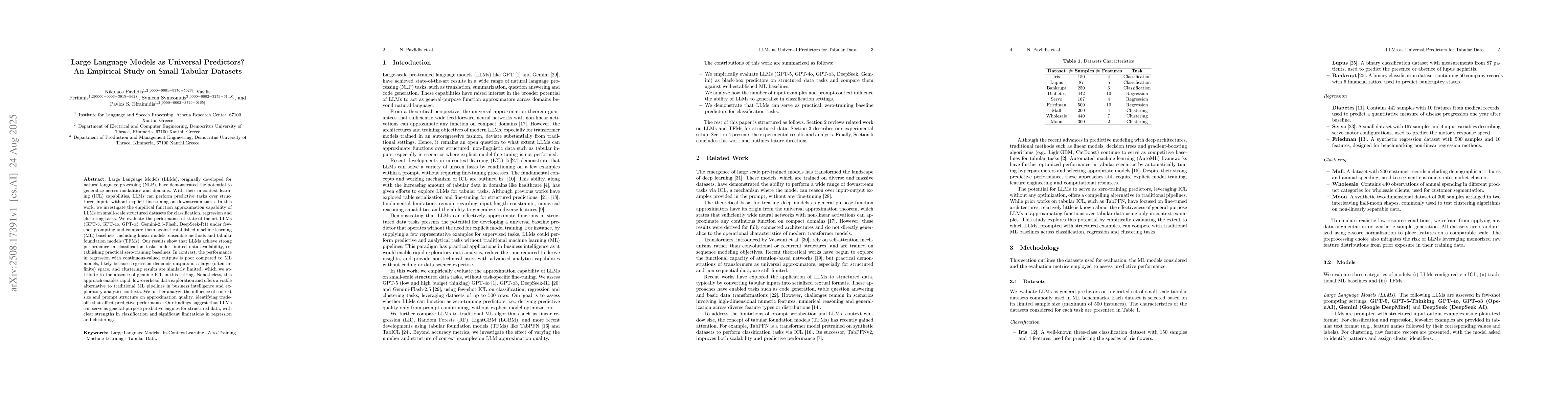 Large Language Models (LLMs), originally developed for natural language processing (NLP), have demonstrated the potential to generalize across modalities and domains. With their in-context learning (ICL) capabilities, LLMs can perform predictive tasks over structured inputs without explicit fine-tuning on downstream tasks. In this work, we investigate the empirical function approximation capability of LLMs on small-scale structured datasets for classification, regression and clustering tasks. We evaluate the performance of state-of-the-art LLMs (GPT-5, GPT-4o, GPT-o3, Gemini-2.5-Flash, DeepSeek-R1) under few-shot prompting and compare them against established machine learning (ML) baselines, including linear models, ensemble methods and tabular foundation models (TFMs). Our results show that LLMs achieve strong performance in classification tasks under limited data availability, establishing practical zero-training baselines. In contrast, the performance in regression with continuous-valued outputs is poor compared to ML models, likely because regression demands outputs in a large (often infinite) space, and clustering results are similarly limited, which we attribute to the absence of genuine ICL in this setting. Nonetheless, this approach enables rapid, low-overhead data exploration and offers a viable alternative to traditional ML pipelines in business intelligence and exploratory analytics contexts. We further analyze the influence of context size and prompt structure on approximation quality, identifying trade-offs that affect predictive performance. Our findings suggest that LLMs can serve as general-purpose predictive engines for structured data, with clear strengths in classification and significant limitations in regression and clustering.