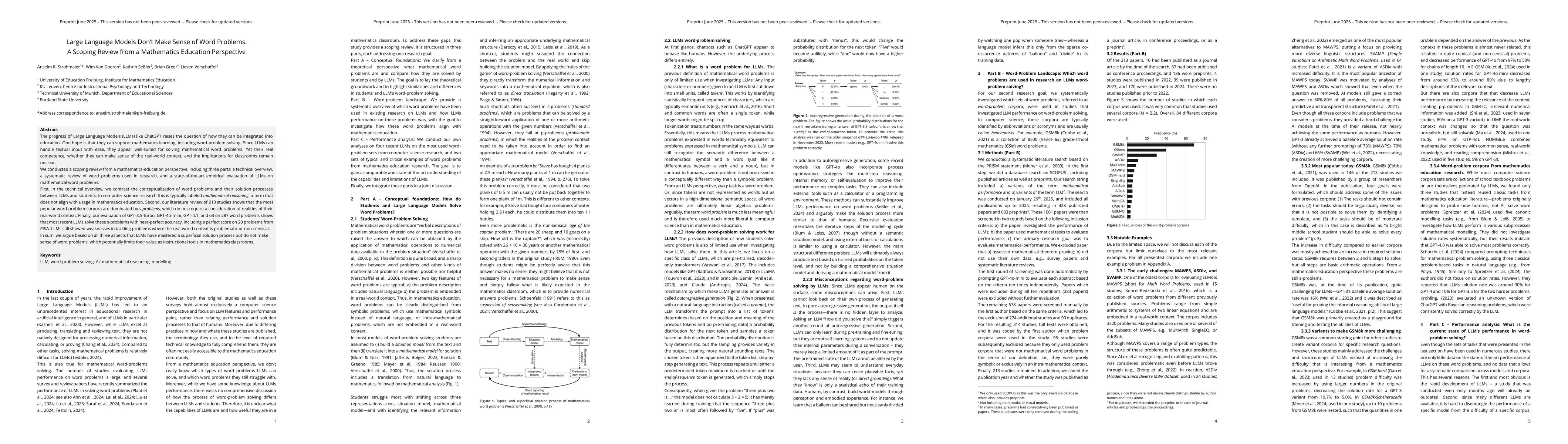 The progress of Large Language Models (LLMs) like ChatGPT raises the question of how they can be integrated into education. One hope is that they can support mathematics learning, including word-problem solving. Since LLMs can handle textual input with ease, they appear well-suited for solving mathematical word problems. Yet their real competence, whether they can make sense of the real-world context, and the implications for classrooms remain unclear. We conducted a scoping review from a mathematics-education perspective, including three parts: a technical overview, a systematic review of word problems used in research, and a state-of-the-art empirical evaluation of LLMs on mathematical word problems. First, in the technical overview, we contrast the conceptualization of word problems and their solution processes between LLMs and students. In computer-science research this is typically labeled mathematical reasoning, a term that does not align with usage in mathematics education. Second, our literature review of 213 studies shows that the most popular word-problem corpora are dominated by s-problems, which do not require a consideration of realities of their real-world context. Finally, our evaluation of GPT-3.5-turbo, GPT-4o-mini, GPT-4.1, and o3 on 287 word problems shows that most recent LLMs solve these s-problems with near-perfect accuracy, including a perfect score on 20 problems from PISA. LLMs still showed weaknesses in tackling problems where the real-world context is problematic or non-sensical. In sum, we argue based on all three aspects that LLMs have mastered a superficial solution process but do not make sense of word problems, which potentially limits their value as instructional tools in mathematics classrooms.