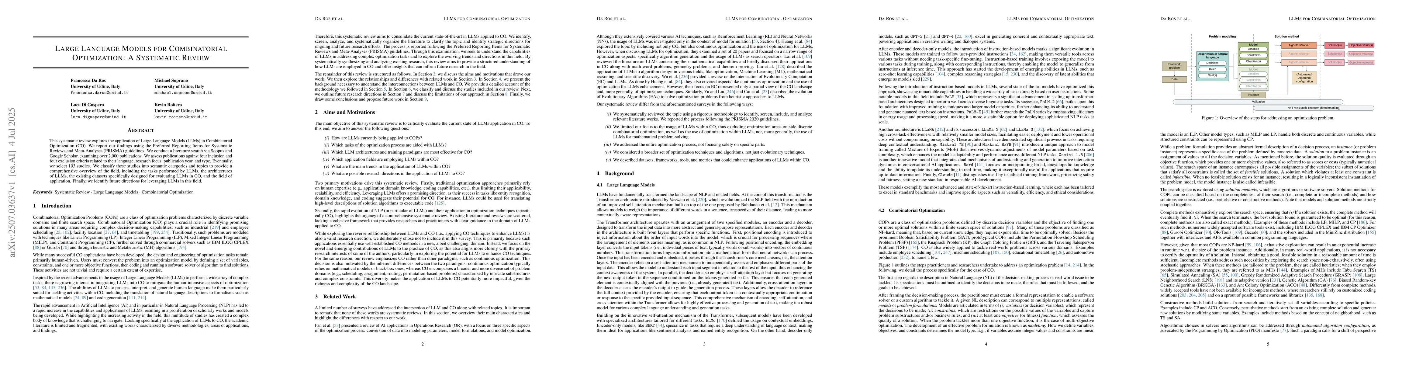 This systematic review explores the application of Large Language Models (LLMs) in Combinatorial Optimization (CO). We report our findings using the Preferred Reporting Items for Systematic Reviews and Meta-Analyses (PRISMA) guidelines. We conduct a literature search via Scopus and Google Scholar, examining over 2,000 publications. We assess publications against four inclusion and four exclusion criteria related to their language, research focus, publication year, and type. Eventually, we select 103 studies. We classify these studies into semantic categories and topics to provide a comprehensive overview of the field, including the tasks performed by LLMs, the architectures of LLMs, the existing datasets specifically designed for evaluating LLMs in CO, and the field of application. Finally, we identify future directions for leveraging LLMs in this field.
