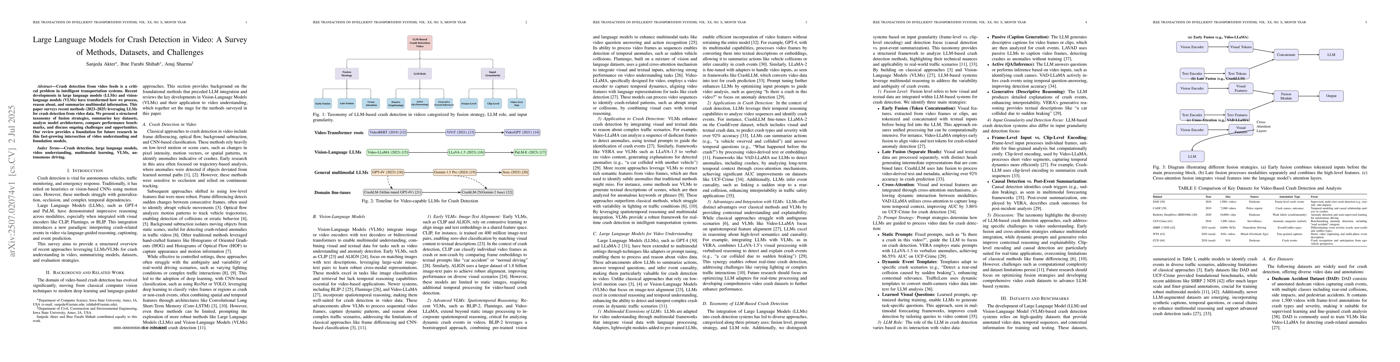 Crash detection from video feeds is a critical problem in intelligent transportation systems. Recent developments in large language models (LLMs) and vision-language models (VLMs) have transformed how we process, reason about, and summarize multimodal information. This paper surveys recent methods leveraging LLMs for crash detection from video data. We present a structured taxonomy of fusion strategies, summarize key datasets, analyze model architectures, compare performance benchmarks, and discuss ongoing challenges and opportunities. Our review provides a foundation for future research in this fast-growing intersection of video understanding and foundation models.