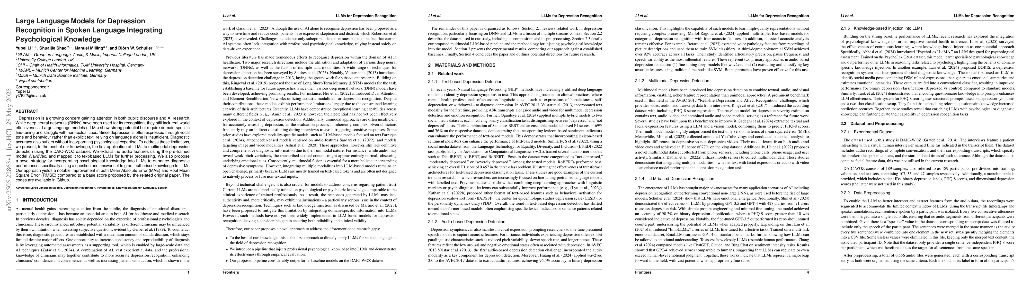 This study uses large language models to improve depression recognition in spoken language by incorporating psychological knowledge and non-textual cues, achieving better diagnostic accuracy.