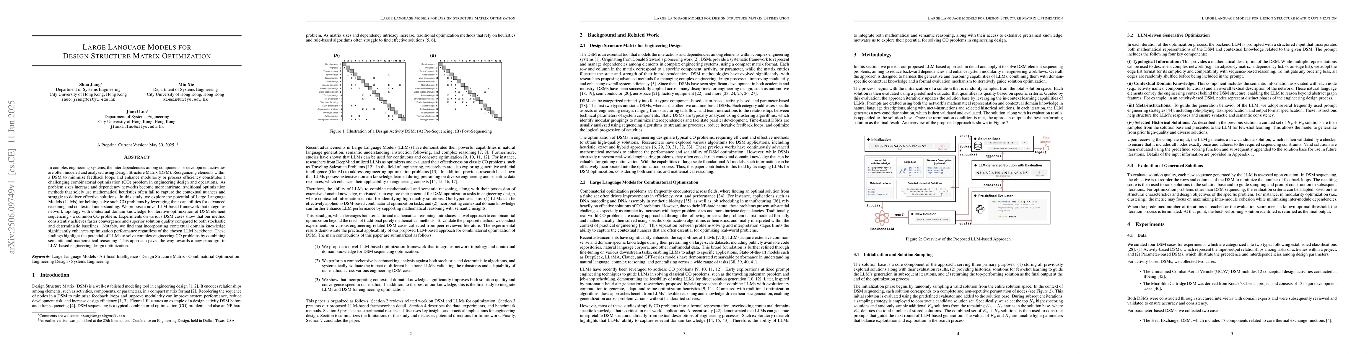 In complex engineering systems, the interdependencies among components or development activities are often modeled and analyzed using Design Structure Matrix (DSM). Reorganizing elements within a DSM to minimize feedback loops and enhance modularity or process efficiency constitutes a challenging combinatorial optimization (CO) problem in engineering design and operations. As problem sizes increase and dependency networks become more intricate, traditional optimization methods that solely use mathematical heuristics often fail to capture the contextual nuances and struggle to deliver effective solutions. In this study, we explore the potential of Large Language Models (LLMs) for helping solve such CO problems by leveraging their capabilities for advanced reasoning and contextual understanding. We propose a novel LLM-based framework that integrates network topology with contextual domain knowledge for iterative optimization of DSM element sequencing - a common CO problem. Experiments on various DSM cases show that our method consistently achieves faster convergence and superior solution quality compared to both stochastic and deterministic baselines. Notably, we find that incorporating contextual domain knowledge significantly enhances optimization performance regardless of the chosen LLM backbone. These findings highlight the potential of LLMs to solve complex engineering CO problems by combining semantic and mathematical reasoning. This approach paves the way towards a new paradigm in LLM-based engineering design optimization.