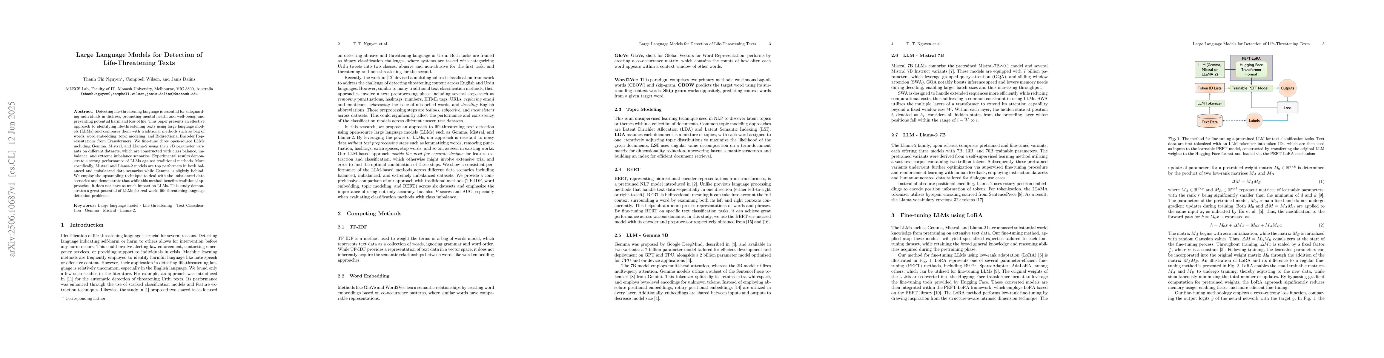 This paper presents an effective approach to detecting life-threatening texts using large language models (LLMs), outperforming traditional methods in both balanced and imbalanced data scenarios.