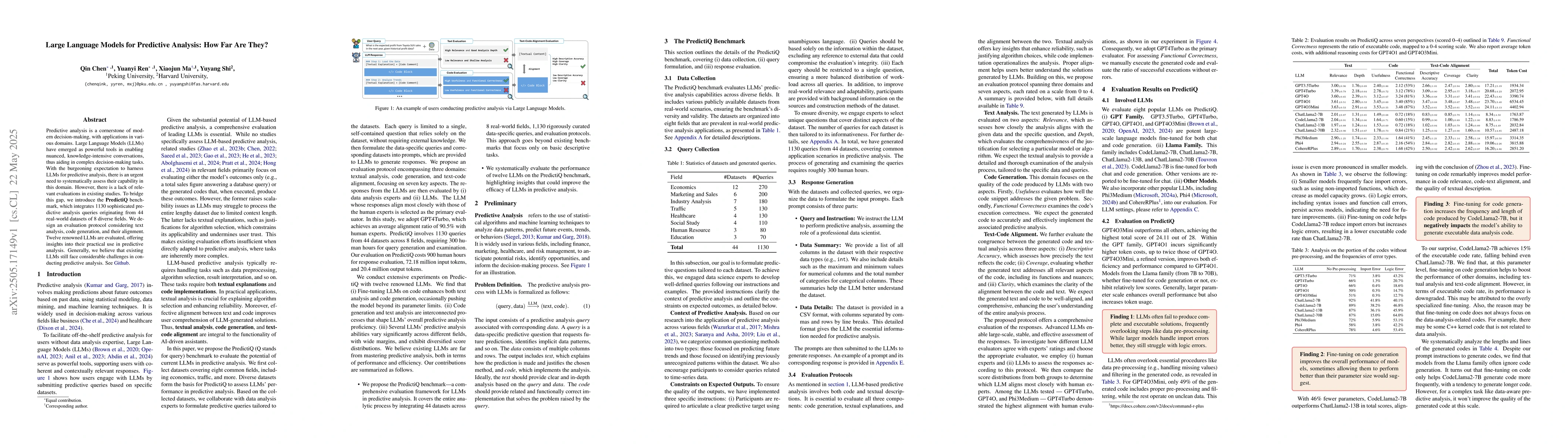 The research introduces the PredictiQ benchmark, comprising 1130 predictive analysis queries from 44 real-world datasets across 8 diverse fields. It evaluates 12 renowned LLMs using an evaluation protocol that considers text analysis, code generation, and their alignment.