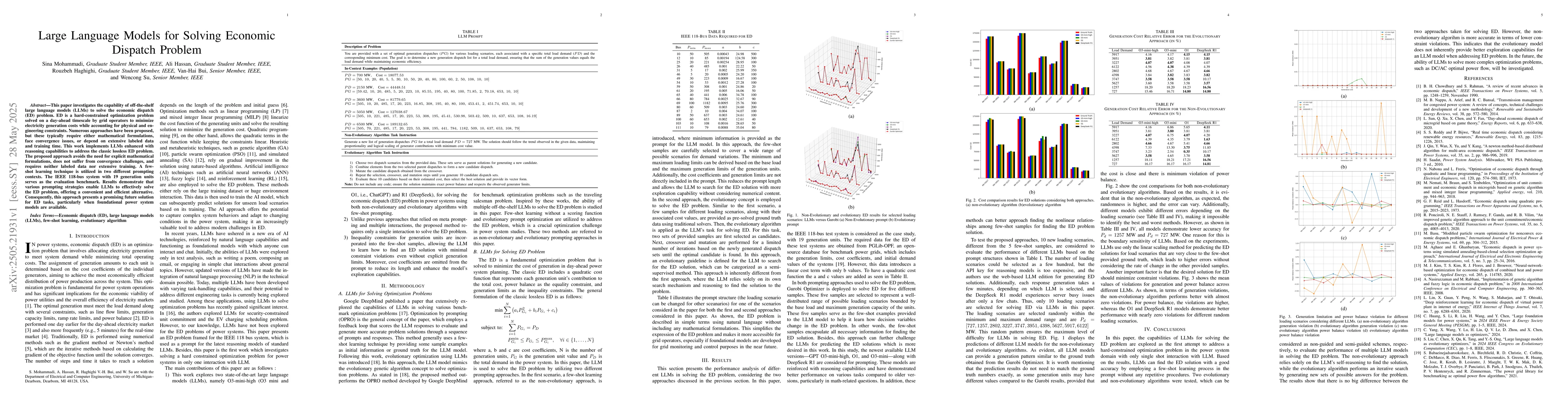 This work is novel in applying LLMs directly to the economic dispatch problem, showcasing their capability to solve it effectively without traditional requirements, thus offering a promising alternative for future ED tasks.