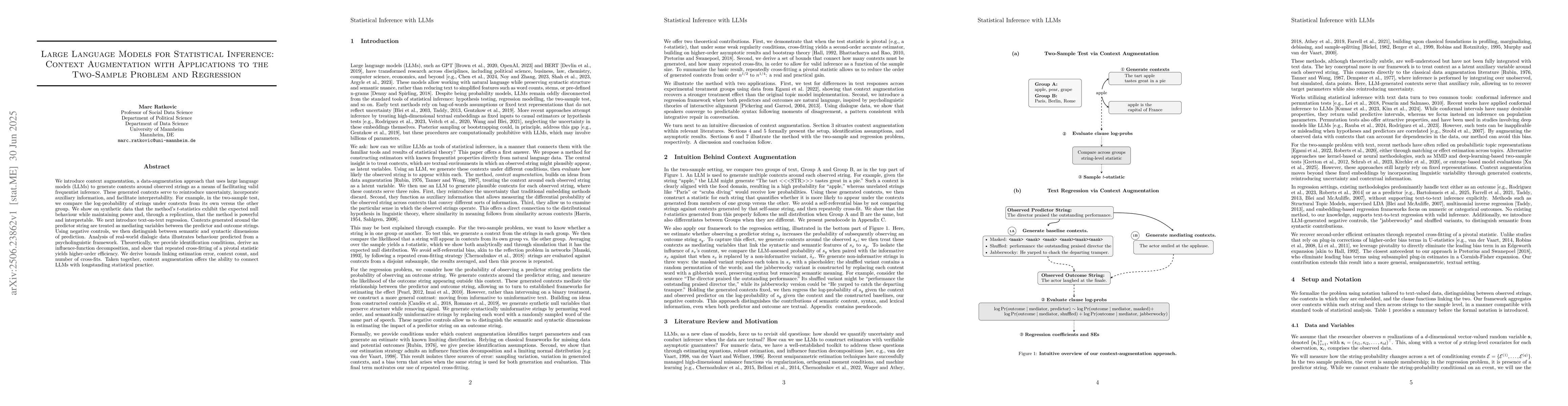 We introduce context augmentation, a data-augmentation approach that uses large language models (LLMs) to generate contexts around observed strings as a means of facilitating valid frequentist inference. These generated contexts serve to reintroduce uncertainty, incorporate auxiliary information, and facilitate interpretability. For example, in the two-sample test, we compare the log-probability of strings under contexts from its own versus the other group. We show on synthetic data that the method's t-statistics exhibit the expected null behaviour while maintaining power and, through a replication, that the method is powerful and interpretable. We next introduce text-on-text regression. Contexts generated around the predictor string are treated as mediating variables between the predictor and outcome strings. Using negative controls, we then distinguish between semantic and syntactic dimensions of prediction. Analysis of real-world dialogic data illustrates behaviour predicted from a psycholinguistic framework. Theoretically, we provide identification conditions, derive an influence-function decomposition, and show that repeated cross-fitting of a pivotal statistic yields higher-order efficiency. We derive bounds linking estimation error, context count, and number of cross-fits. Taken together, context augmentation offers the ability to connect LLMs with longstanding statistical practice.