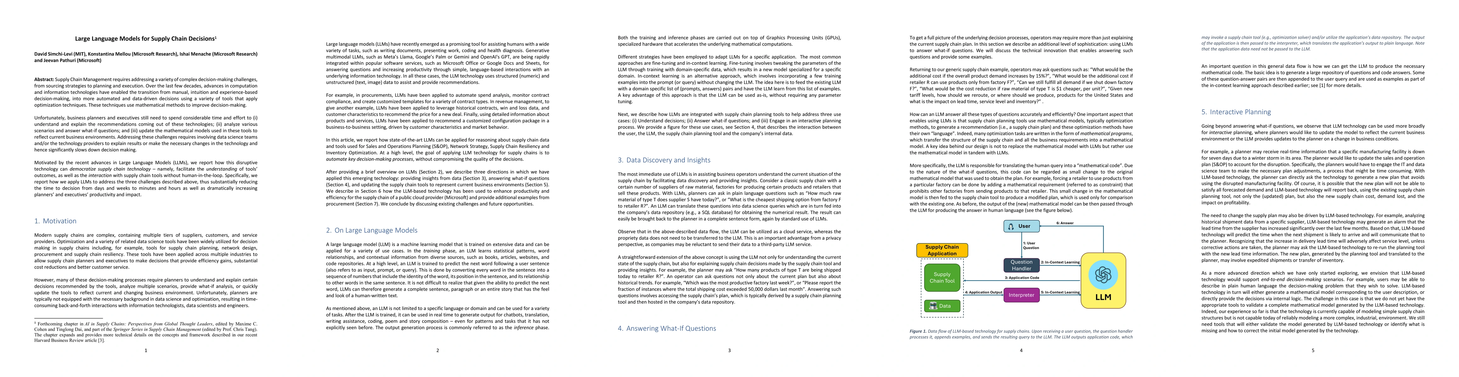 Supply Chain Management requires addressing a variety of complex decision-making challenges, from sourcing strategies to planning and execution. Over the last few decades, advances in computation and information technologies have enabled the transition from manual, intuition and experience-based decision-making, into more automated and data-driven decisions using a variety of tools that apply optimization techniques. These techniques use mathematical methods to improve decision-making. Unfortunately, business planners and executives still need to spend considerable time and effort to (i) understand and explain the recommendations coming out of these technologies; (ii) analyze various scenarios and answer what-if questions; and (iii) update the mathematical models used in these tools to reflect current business environments. Addressing these challenges requires involving data science teams and/or the technology providers to explain results or make the necessary changes in the technology and hence significantly slows down decision making. Motivated by the recent advances in Large Language Models (LLMs), we report how this disruptive technology can democratize supply chain technology - namely, facilitate the understanding of tools' outcomes, as well as the interaction with supply chain tools without human-in-the-loop. Specifically, we report how we apply LLMs to address the three challenges described above, thus substantially reducing the time to decision from days and weeks to minutes and hours as well as dramatically increasing planners' and executives' productivity and impact.