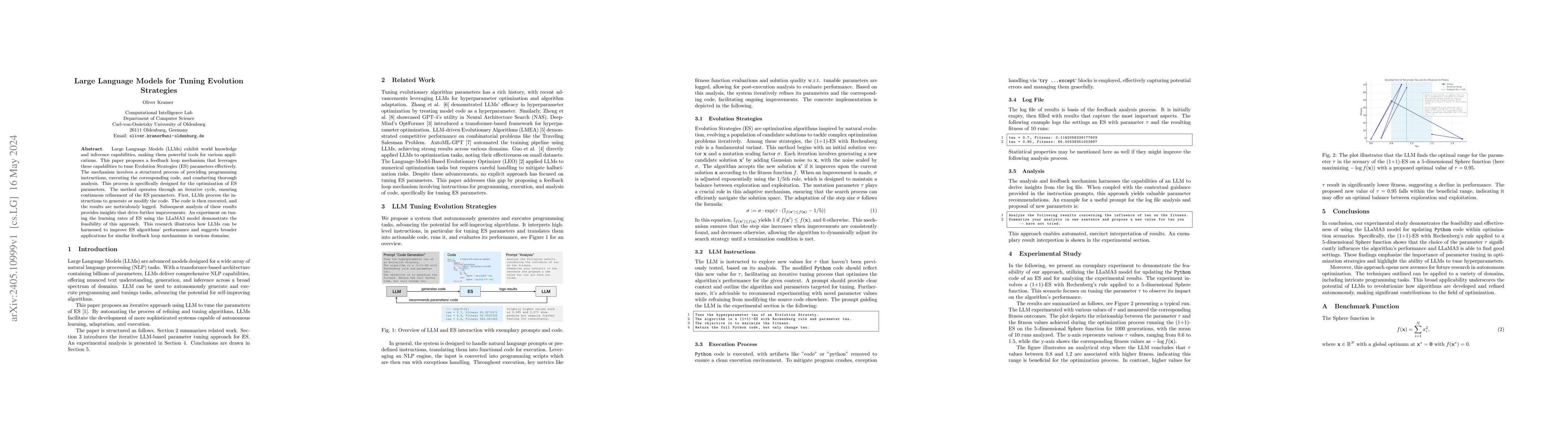 This paper proposes a feedback loop mechanism using Large Language Models (LLMs) to optimize Evolution Strategies (ES) parameters by iteratively generating, executing, and analyzing code, demonstrating improved learning rates with the LLaMA3 model and suggesting broader applications for similar mechanisms.
