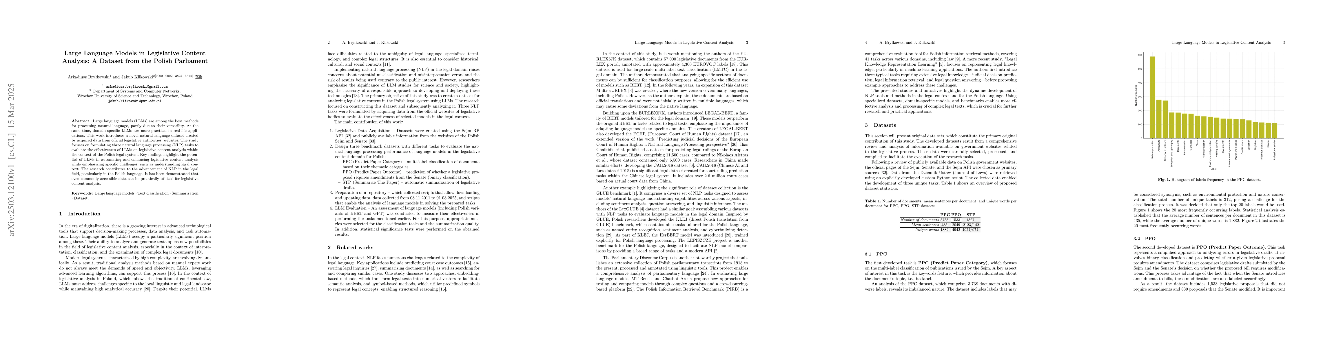 Large language models (LLMs) are among the best methods for processing natural language, partly due to their versatility. At the same time, domain-specific LLMs are more practical in real-life applications. This work introduces a novel natural language dataset created by acquired data from official legislative authorities' websites. The study focuses on formulating three natural language processing (NLP) tasks to evaluate the effectiveness of LLMs on legislative content analysis within the context of the Polish legal system. Key findings highlight the potential of LLMs in automating and enhancing legislative content analysis while emphasizing specific challenges, such as understanding legal context. The research contributes to the advancement of NLP in the legal field, particularly in the Polish language. It has been demonstrated that even commonly accessible data can be practically utilized for legislative content analysis.