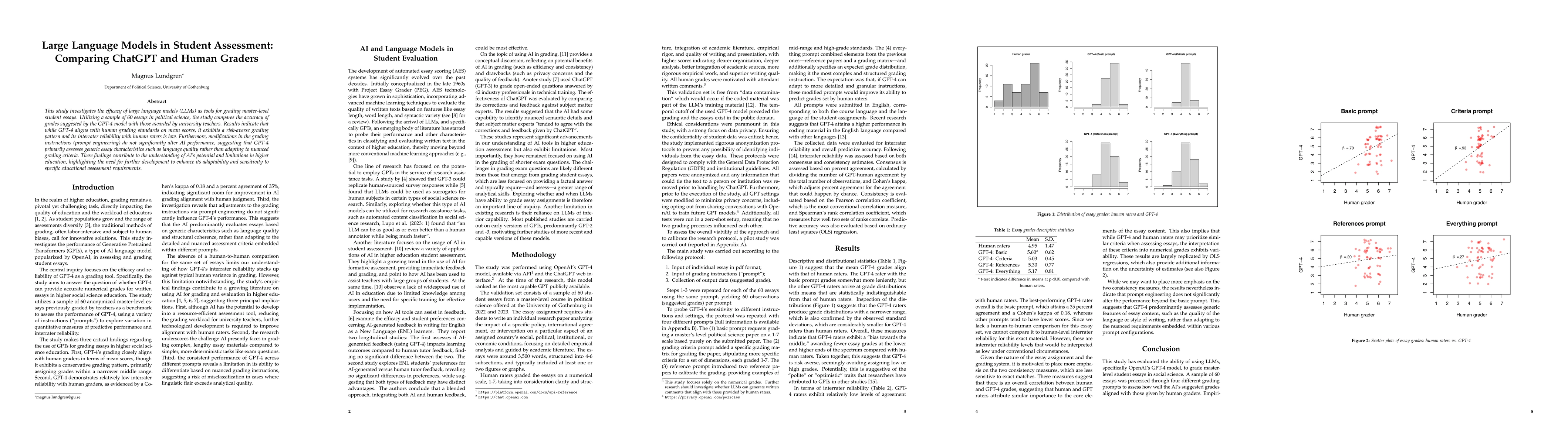 This study investigates the efficacy of large language models (LLMs) as tools for grading master-level student essays. Utilizing a sample of 60 essays in political science, the study compares the accuracy of grades suggested by the GPT-4 model with those awarded by university teachers. Results indicate that while GPT-4 aligns with human grading standards on mean scores, it exhibits a risk-averse grading pattern and its interrater reliability with human raters is low. Furthermore, modifications in the grading instructions (prompt engineering) do not significantly alter AI performance, suggesting that GPT-4 primarily assesses generic essay characteristics such as language quality rather than adapting to nuanced grading criteria. These findings contribute to the understanding of AI's potential and limitations in higher education, highlighting the need for further development to enhance its adaptability and sensitivity to specific educational assessment requirements.