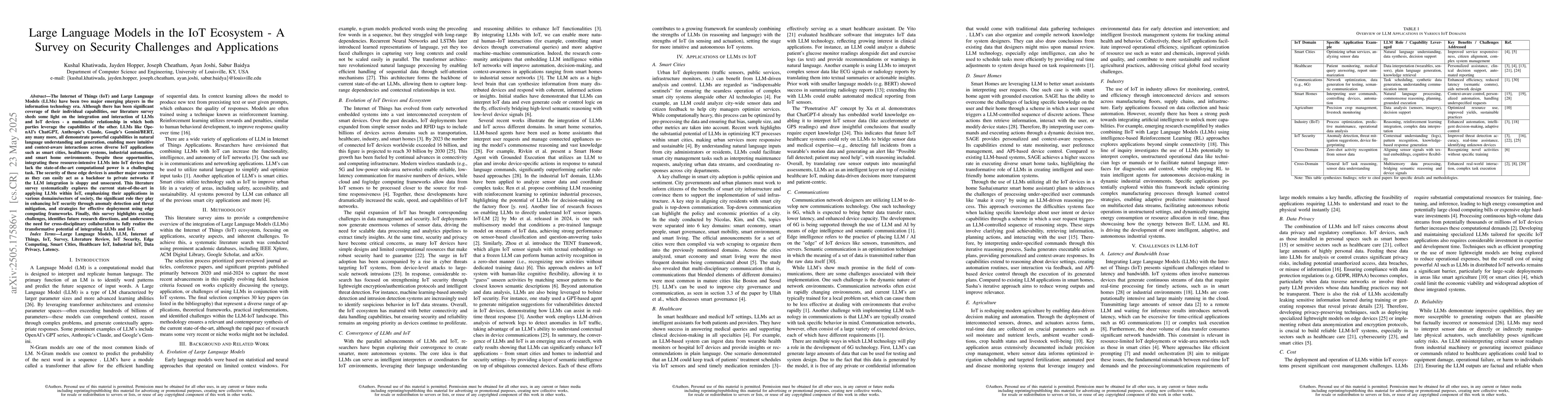 The paper presents a systematic literature survey exploring the integration and interaction of Large Language Models (LLMs) and IoT devices, focusing on applications, security enhancements, and deployment strategies.