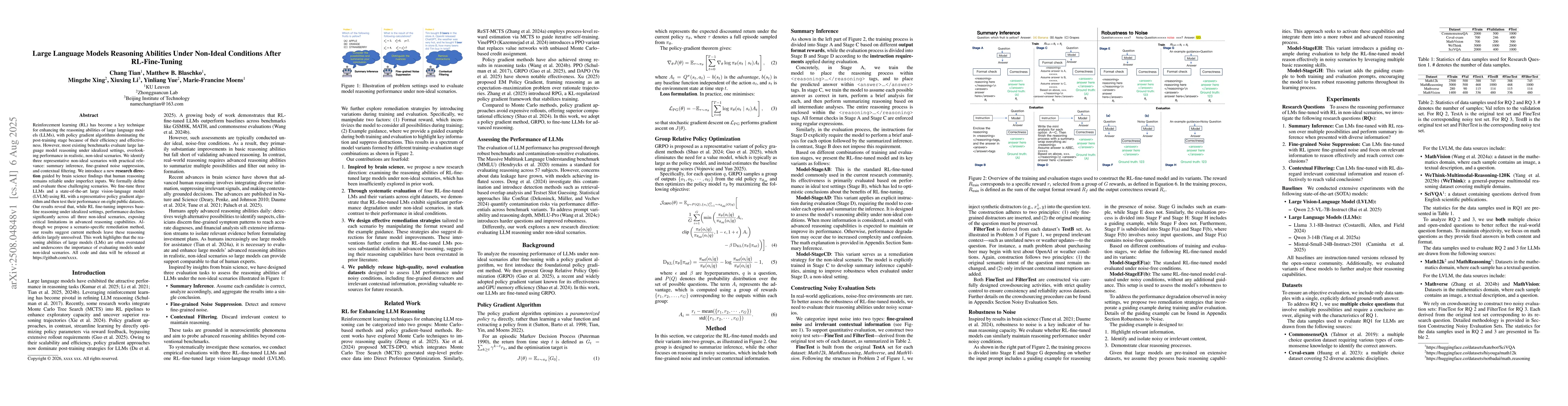 The research employs reinforcement learning (RL) fine-tuning with a policy-gradient algorithm, specifically Group Relative Policy Optimization (GRPO), to enhance large language models (LLMs) and a vision-language model (LVLM) for reasoning tasks. Three LLMs (Llama3.1, Mistral, Qwen3) and one LVLM (Qwen2.5-VL) are fine-tuned and evaluated on eight public datasets across three non-ideal scenarios: summary inference, fine-grained noise suppression, and contextual filtering.